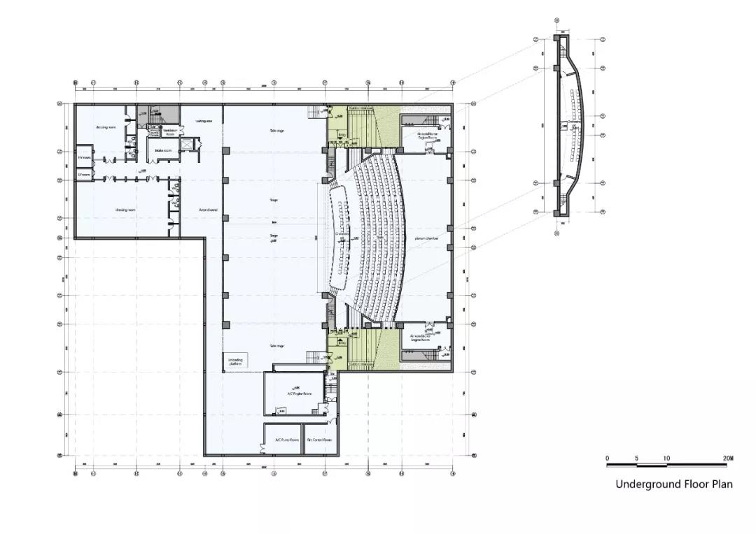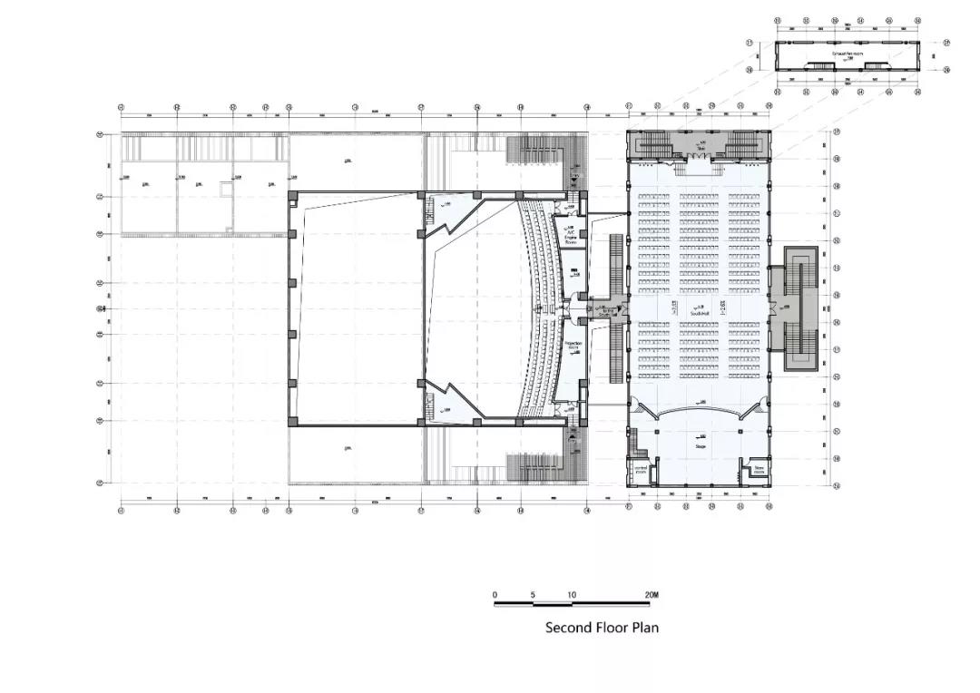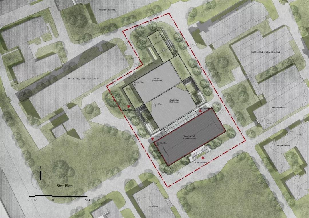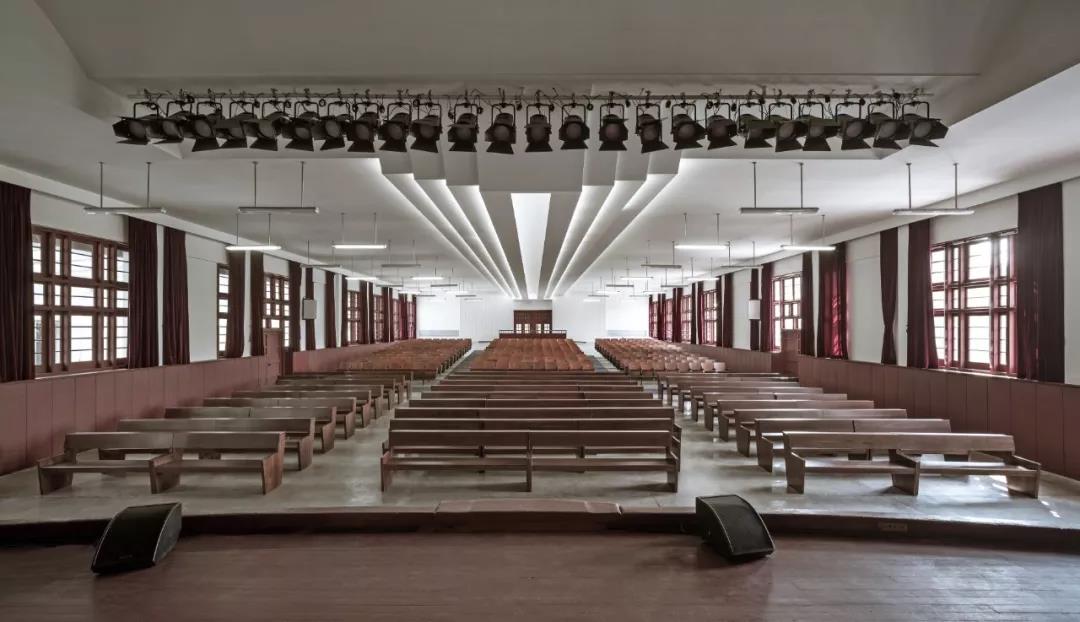 另一方面,相輝堂原有的容量已經(jīng)無法滿足禮堂的功能要求。擴(kuò)建建筑為一座751座的多功能劇場,由老相輝堂作為其前廳,共同構(gòu)成復(fù)旦大學(xué)的新禮堂。擴(kuò)建建筑在與老建筑協(xié)調(diào)共生的前提下,既滿足了觀演、學(xué)術(shù)交流、會議活動的功能,又保留了復(fù)旦舊有的校園格局,復(fù)刻了一種歷史記憶。