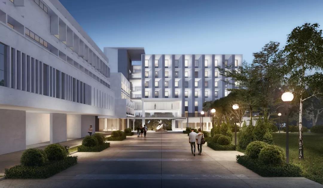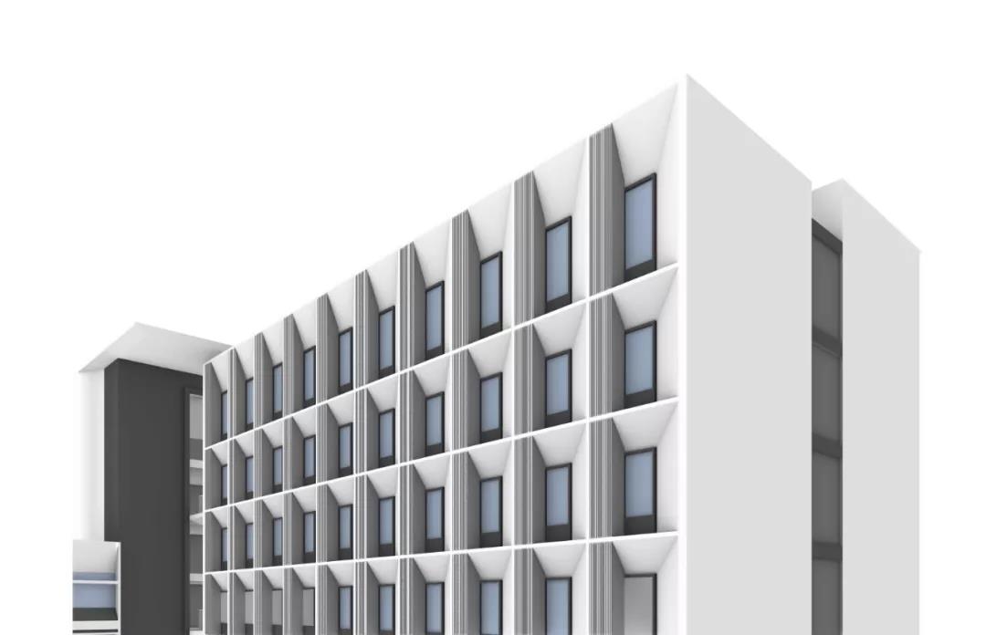 設計之初,我們思考如何將新建宿舍樓在一個已存在的建筑群里形成一個相適應的共存關系,創造一個能與自然交融、 蘊含更多可能且開放連續的建筑空間。故此,設計延續了原有基地的建筑肌理,根據學校宿舍的功能需求,在注重建筑形態及外部空間的塑造與校區融合的基礎上,以圖書館為固定標志性建筑,遵循軸向平面上方向感的設計原則,保留一條通往聯合書院大道遠處景觀的視覺走廊,并通過和諧的尺度及相似高度的建筑形態和圖書館、曾肇添樓、思源館以集群的形式圍繞中央庭院進行串聯圍合展開對話。