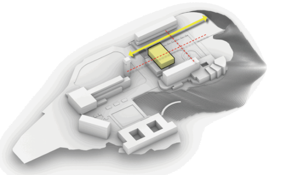 通過藝術雕塑穿插其中的有遮蔽的下沉景觀庭院,作為校區新的公共樞紐位于聯合書院大道軸線的末端,在這個自然流通且無能源設備損耗的風廊場所,師生們可在景觀與建筑之間毫無阻礙的出入,進行單純的放松、閱讀或各種簡單的主題文化社交活動。急車輛通道及泊車場則自然隱匿在建筑體塊背側較低的地面,在具備建筑入口廣場的功能的同時也減少了行車對聯合書院草地的干擾。