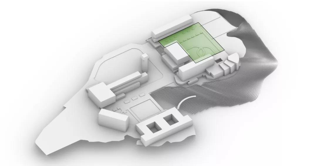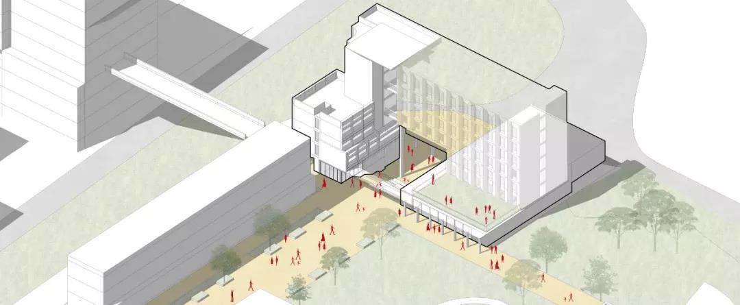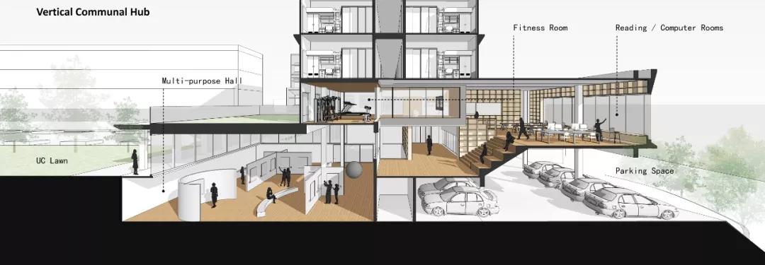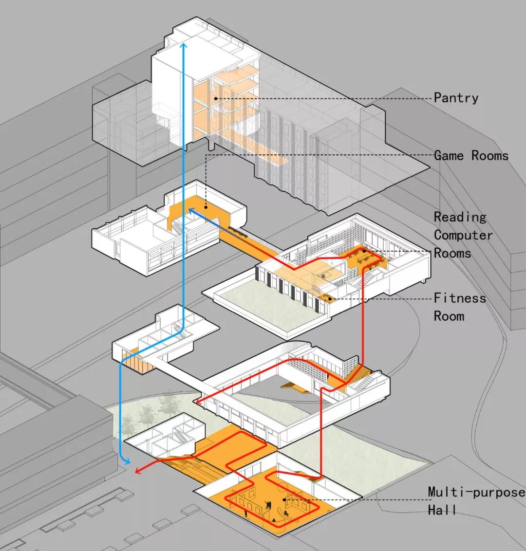 為減少建筑對現有環境的體量影響,讓建筑的尺度更加親切舒適,我們將多功能廳設計為半下沉的形態,它與下沉廣場直接相連,創造出室內外的無縫連接。共享的公共設施以開放的規劃和多層次的方式組織起來,通過置入的閱覽室、電腦室、健身中心圍繞連續的公共路線和平臺組織,為舍區創造一個充滿活力的多元化互動公共空間場所。
