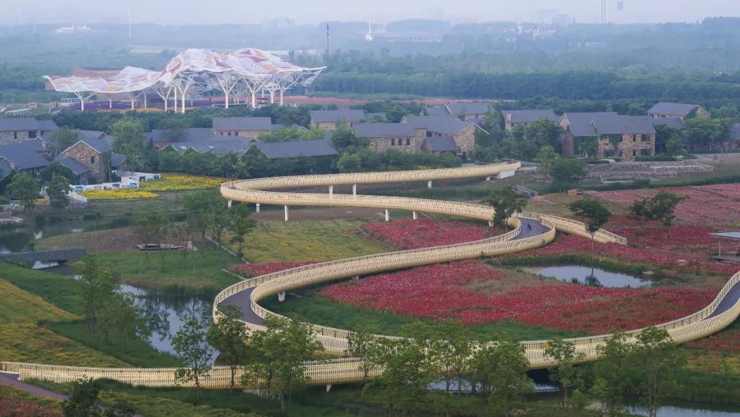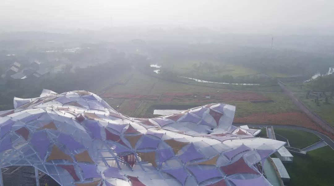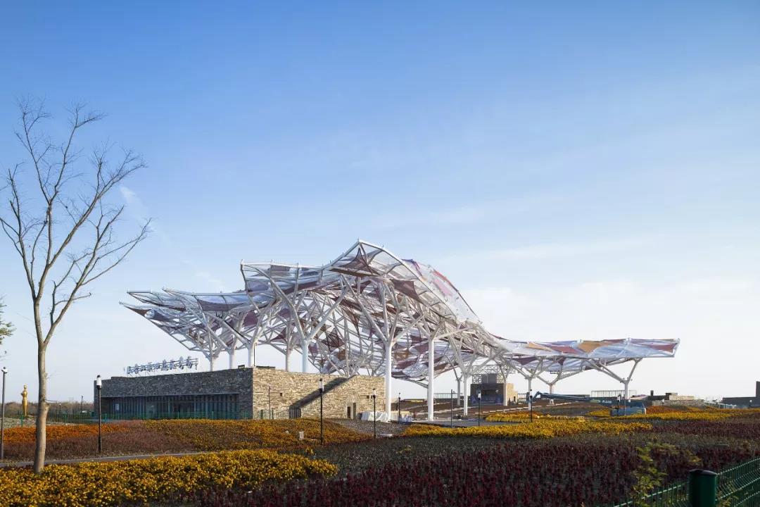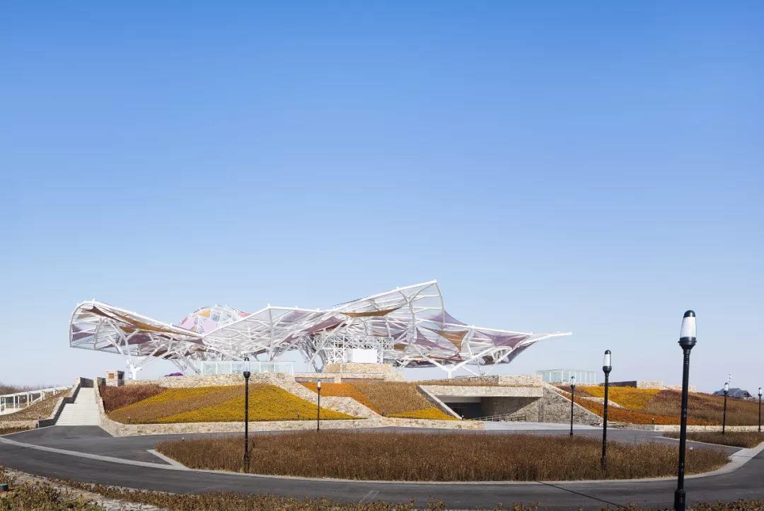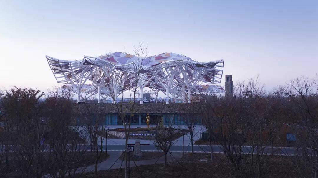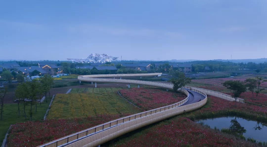 宿遷三臺山森林公園花田劇場,一次大型景觀建筑的設計挑戰。通常景觀建筑多為小體量,掩映在景觀中。劇場容納3000座室外觀眾席,有可遮蔽的屋頂覆蓋,體量遠大于一般景觀建筑。劇場周圍綿延五公里三色花海,兩公里彩虹橋蜿蜒其間。劇場如何消解較大的體量,融入花海無盡延伸的背景是設計的難點。