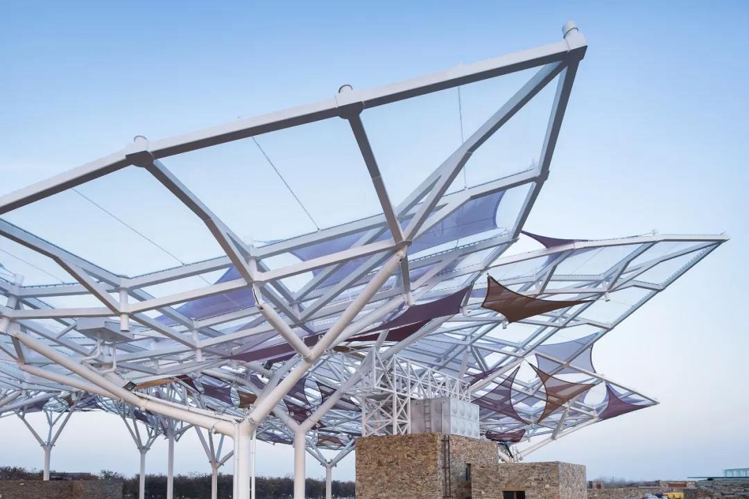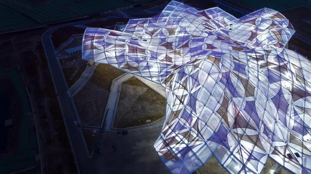 屋面三層張拉膜,中間透明膜遮雨,上下兩層彩色膜遮陽。彩色膜的三種色彩呼應花田粉,黃,紫三種顏色。彩色膜的選色是設計過程中遇到的又一技術難題。幾種正常光線照射下色彩鮮艷的膜,吊掛到屋頂逆光下從下往上看變成了灰色,進行了多次色彩實驗,發現網格膜在逆光下的發色反而比光面膜準確。最終選擇了網格膜,廠家訂制了三種接近花田三色花的特制顏色,與衲田花海呼應。