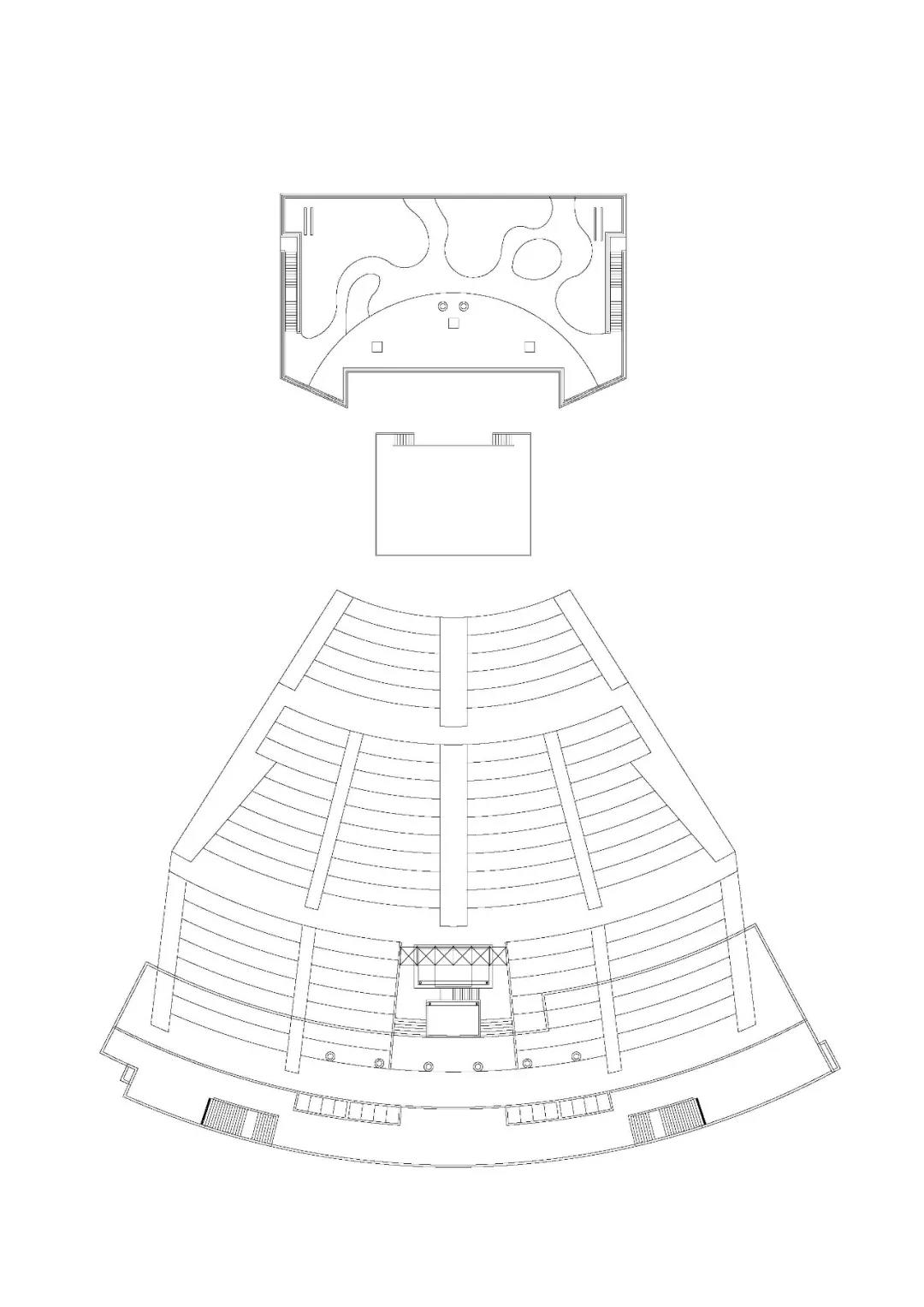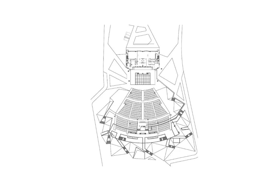 影響劇場體量感的最重要因素是結構選型。常用的拱或懸索等大跨結構形式,在花海當中很容易形成類似體育場或者機場候機樓的印象。分析形成這種感覺的原因,與結構線性的轉折拐點多少,線性組合均有關系。