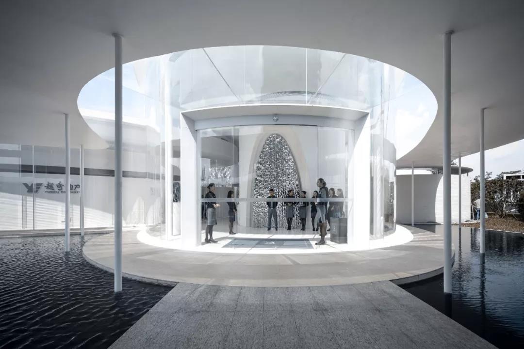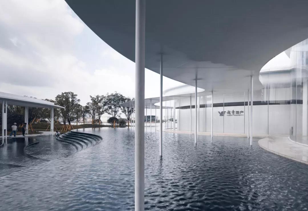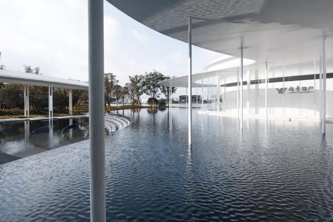 展廊主體由兩個橢圓和一個圓形相嵌合,外圈由25mm厚的鋼板飄蓬環繞,并由錯落分布的75mm直徑的鋼柱支撐。在外部,鏡面的水景,白色的反光材料,配合纖薄的實體,環境和陽光被柔和地反射進來,創造一種勻質、連續、透明的感覺。