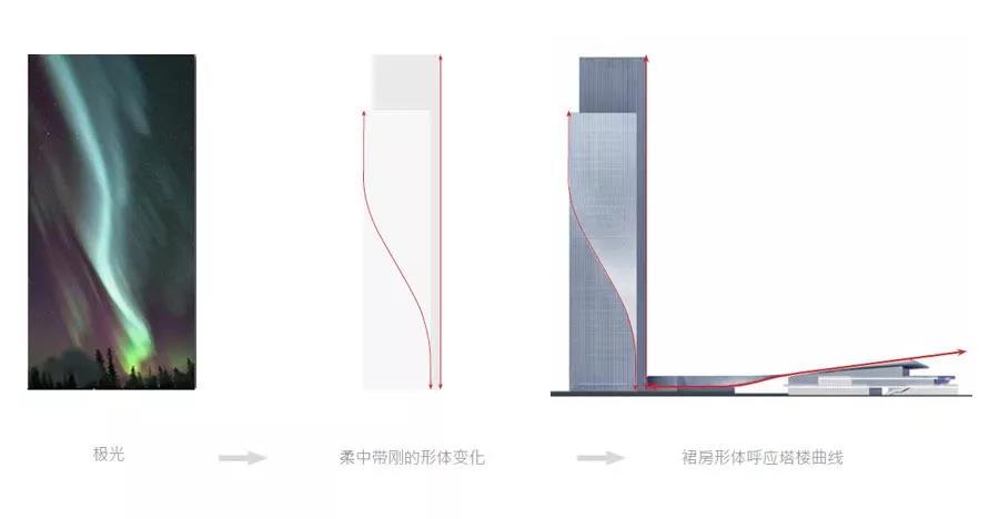 “項目面對廣場這一寬闊的開放空間,本身具備成為標志性塔樓的有利條件。而大扭擰角度的幕墻可以在第一時間抓住所有人的視線。”項目設計師韋業啟(Ken Wai)從極光這一絢麗而少見的發光現象中汲取靈感,將辦公塔樓南側與東側立面頂底相連,以獨特的雙曲面模擬極光弧幕狀優美的姿態,上演一場“光之舞”,從不同角度可以欣賞到不斷變化的曲面形態。
