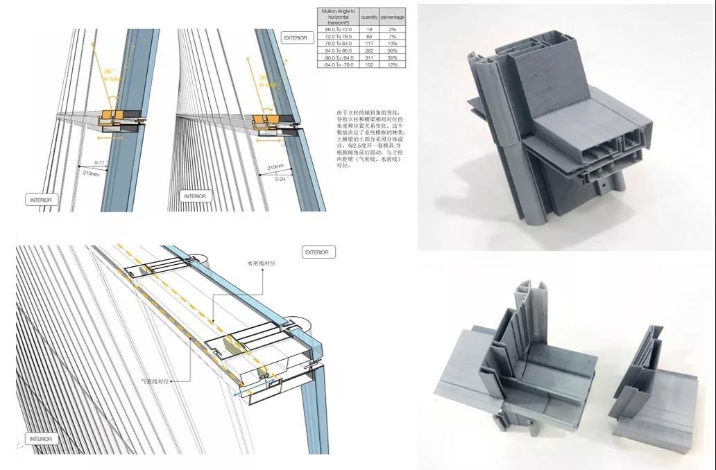 對于扭曲較大的雙曲面超高層而言,其擬合雙曲面一直是一大難題,設計師韋業啟與RFR通過深度合作,以復雜曲面幕墻BIM和雙曲幕墻單元的玻璃冷彎技術攻克了這一挑戰。獨創的幕墻系統能適應單元板塊多角度、多尺寸變化的要求,確保建成效果與模擬效果高度一致,并保證幕墻性能。而采用三維組框+平板玻璃冷彎設計的玻璃單元,以打破國內最大單元玻璃翹曲量的86mm讓設計得以實現。整個過程真正做到了從整體幾何優化分析、幕墻模型建模、LOD400加工圖深度構建建模,到加工圖數據自動生成和檢查的全過程幕墻BIM流程。