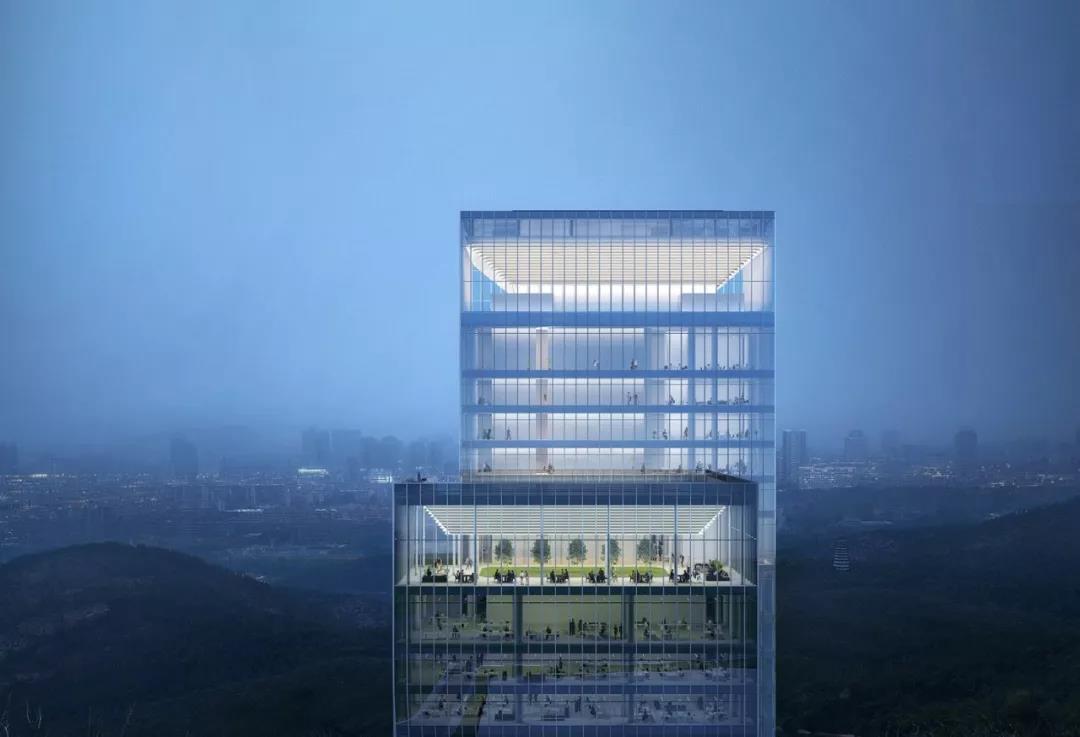 “幕墻不僅是建筑輪廓的勾勒,也是對內部空間進行雕塑和保護。”設計師韋業啟在塔冠巧妙地使用幕墻語言,以透明的玻璃幕墻配合燈光照明表達“光之谷”的概念,既與整體設計呼應統一,又與塔身辦公區域進行了功能區分示意,同時也將預留機房、擦窗機等基礎設施集中安置在主冠的“谷”中,不影響整體視覺效果,讓功能統一純粹。