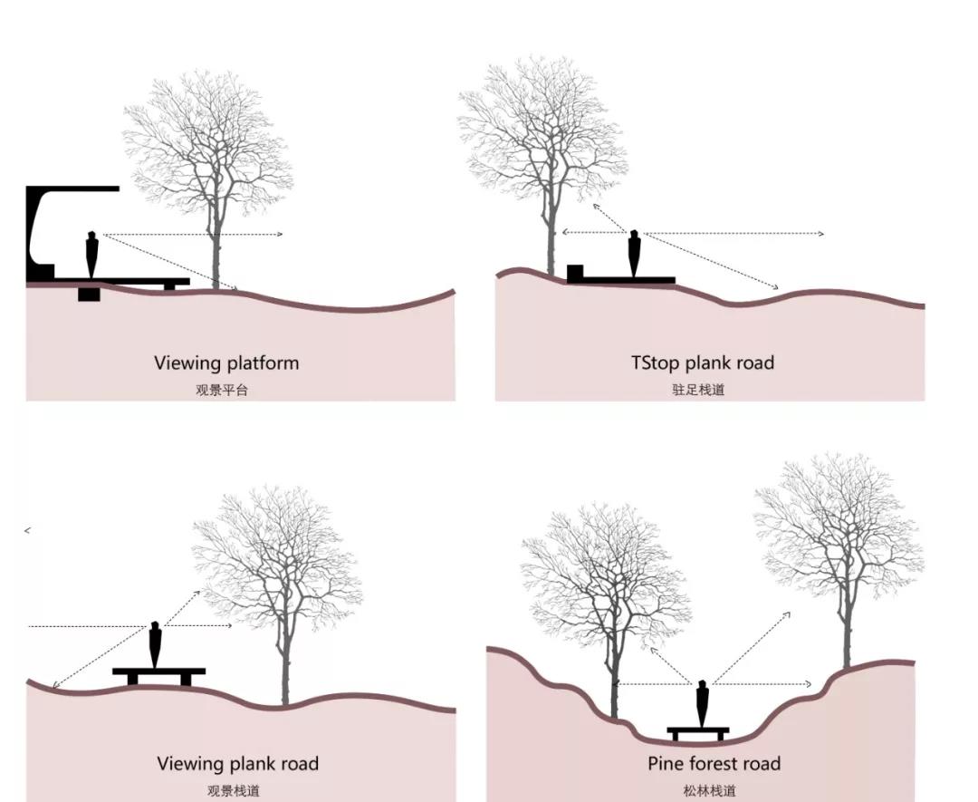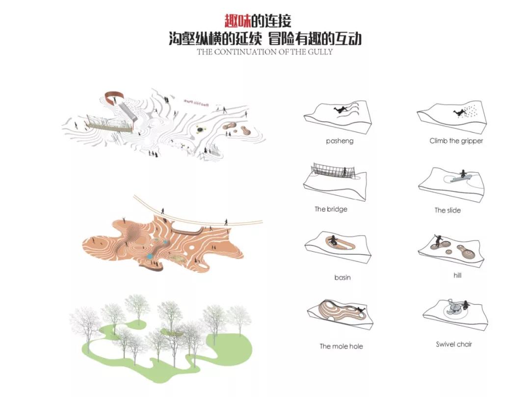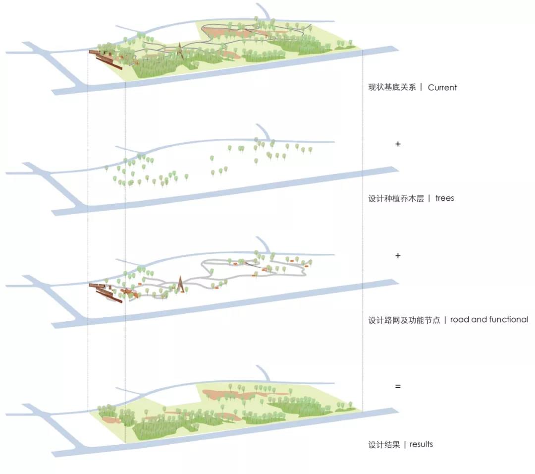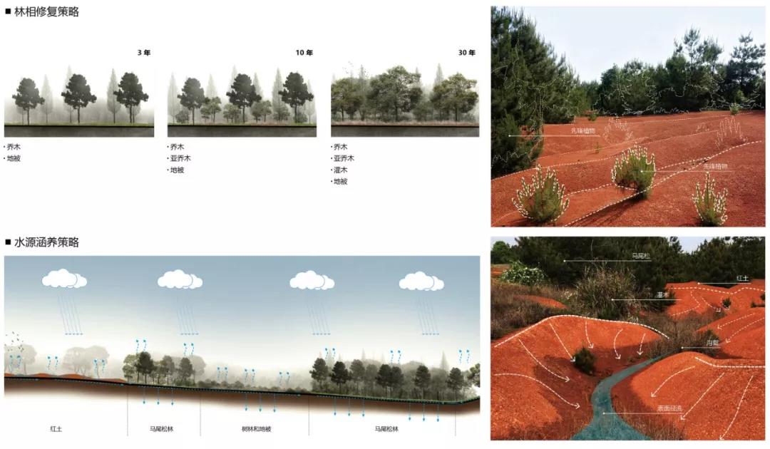 本場地有著獨特的紅土地貌和原生植被群落,但卻面臨現狀水土流失和動植物多樣性失衡等問題,基地內的生態敏感度脆弱。整體設計策略在通過分析現狀植被,豎向高程,水文徑流等的基礎上,從生態修復,社會科普和自然體驗多個維度出發,對這片場地進行保護性開發。同時確立設計的三低原則:低介入,低維護,低造價,最小程度的減少對現狀地質和植被的破壞。