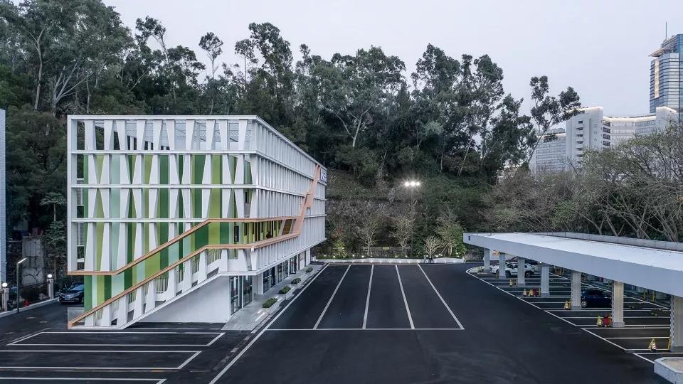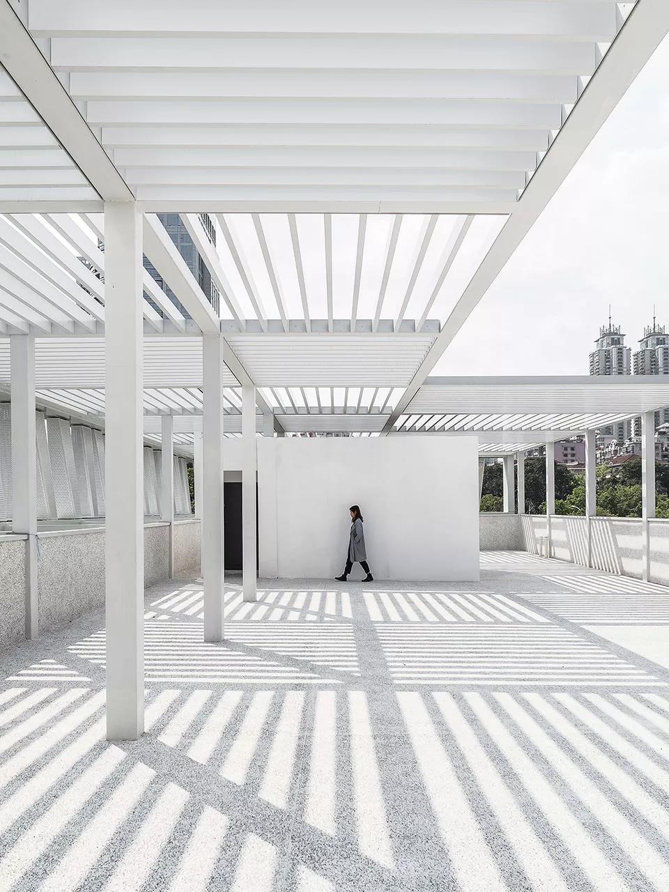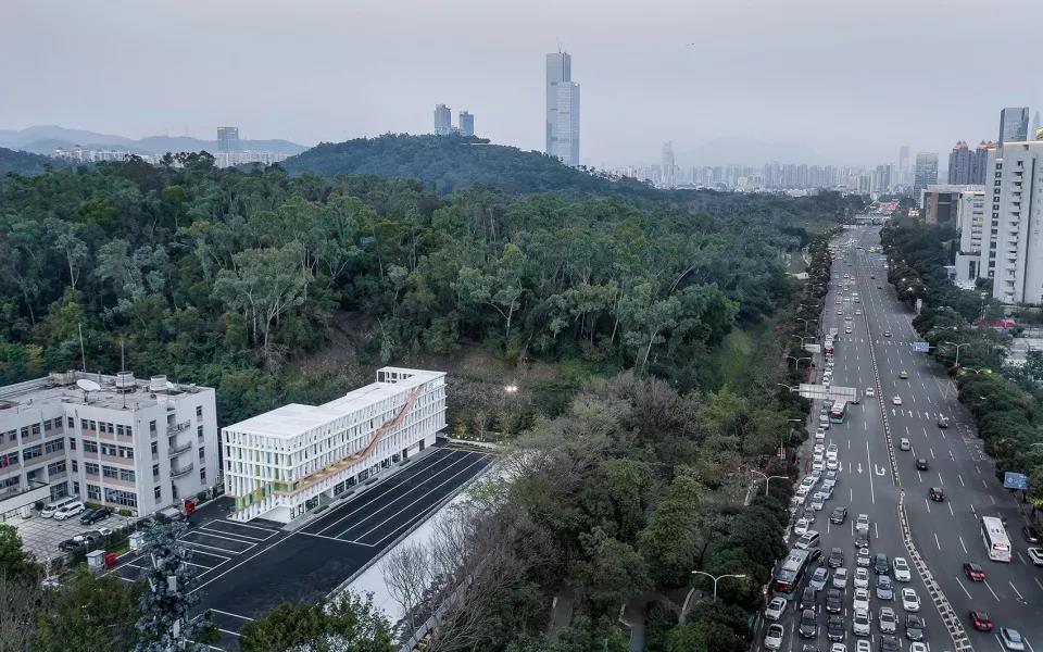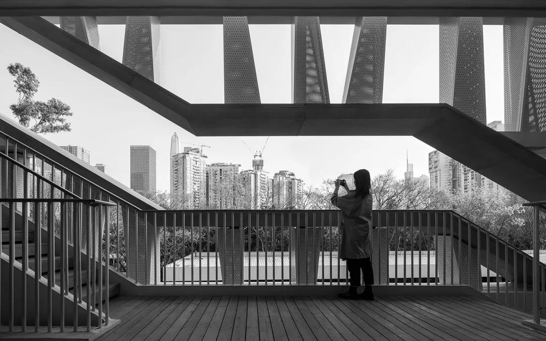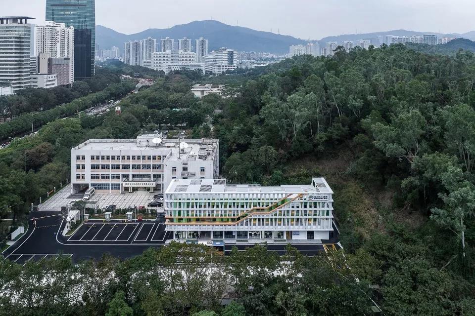 格柵覆蓋了大部分屋頂空間,除了具有遮陽(yáng)作用,還與立面的幕墻形成一個(gè)完整結(jié)構(gòu)系統(tǒng),力學(xué)更優(yōu)、更穩(wěn)定。在靠山一側(cè),留出的開(kāi)敞空間成為與自然相接觸的花園。這個(gè)半開(kāi)敞的屋頂空間容納了豐富的活動(dòng):種植農(nóng)作物、開(kāi)室外派對(duì)和觀看福田中心區(qū)城市夜景。