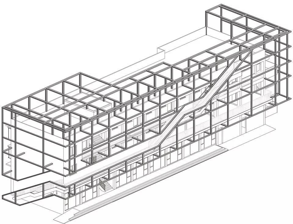 根據(jù)原有建筑梁的位置,新的幕墻分為四層,每一層靠原有結(jié)構(gòu)出挑鋼梁支撐,并且每隔3.6米設(shè)置豎向鋼柱,使得加建的幕墻形成穩(wěn)定的結(jié)構(gòu)框架。