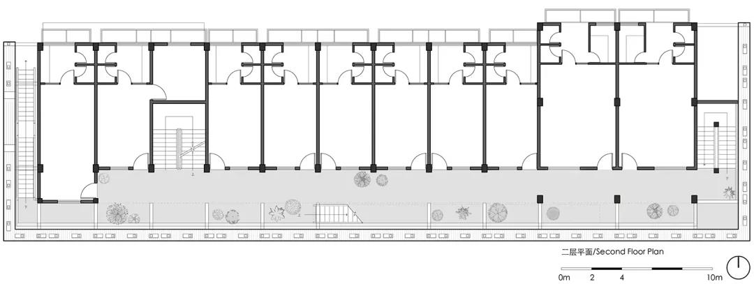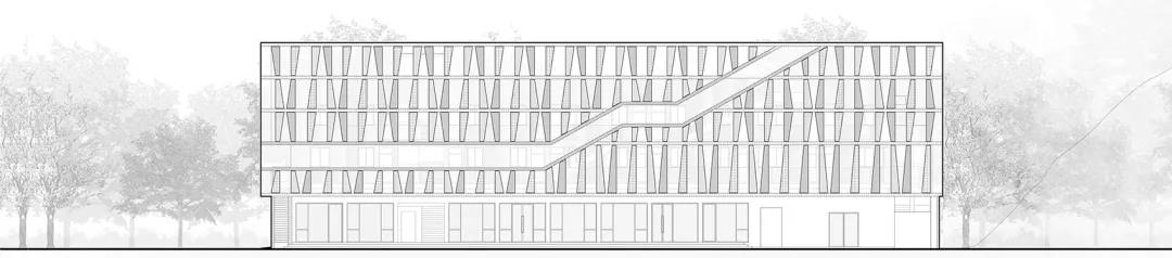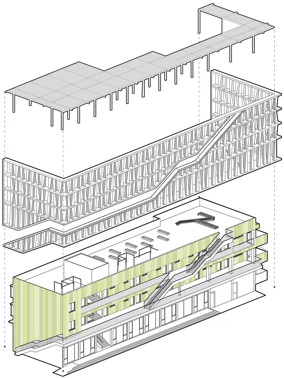 除此之外,設(shè)計(jì)在建筑里引入一條公共流線,通過(guò)樓梯串聯(lián)了一層北面食堂出口、二層、三層和屋頂空間,使不同標(biāo)高的交流場(chǎng)所建立更緊密的聯(lián)系。新加的幕墻表皮也形成一條長(zhǎng)條形開(kāi)口對(duì)應(yīng)著這條公共流線,使得內(nèi)部空間與外立面形式統(tǒng)一。人在行走過(guò)程中也能透過(guò)開(kāi)闊的開(kāi)口觀看外部的綠樹(shù)與城市。