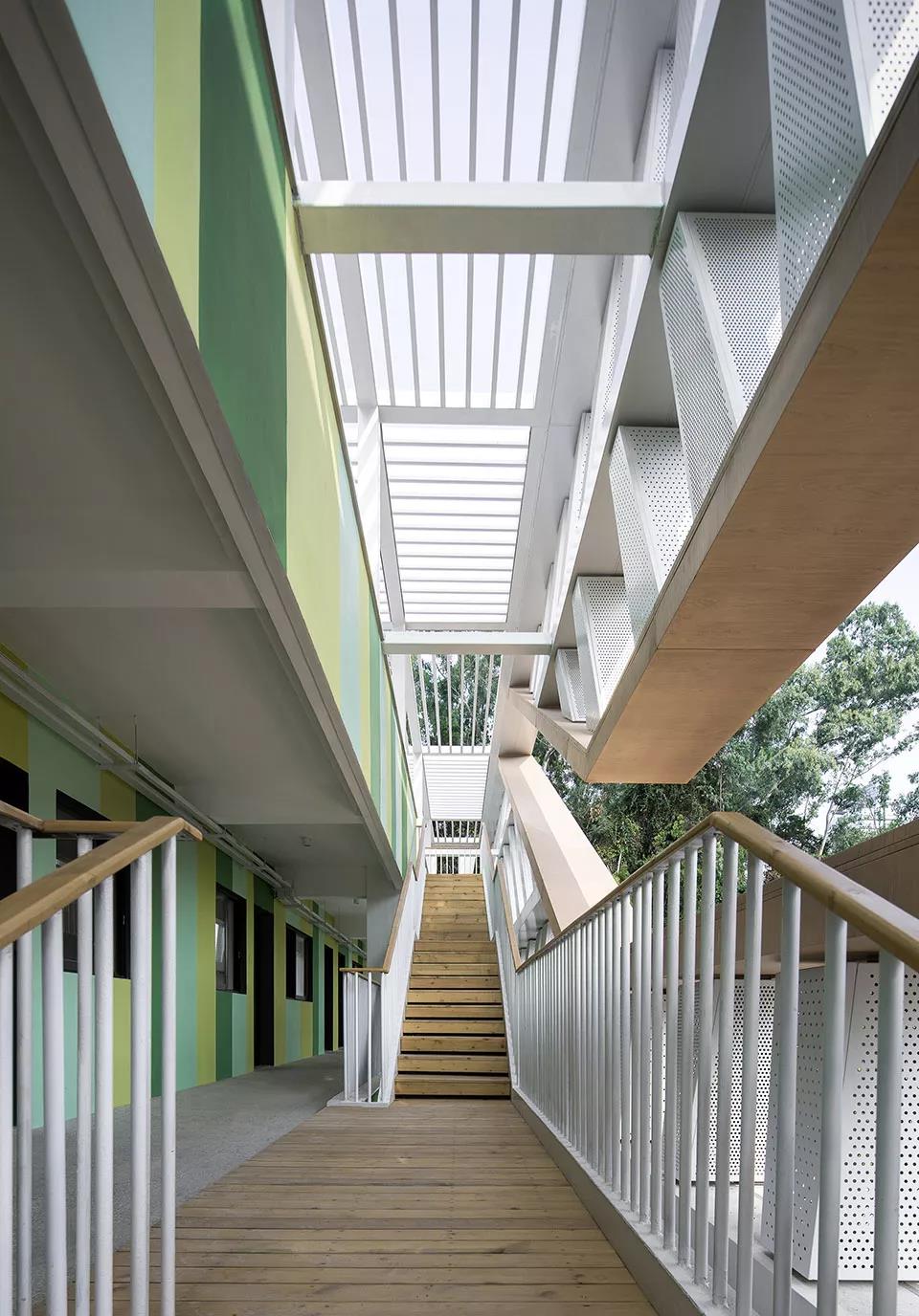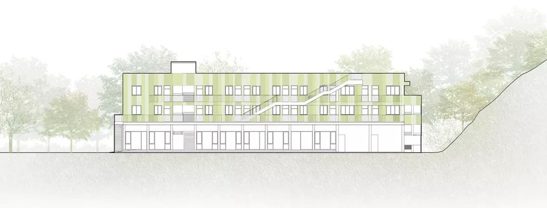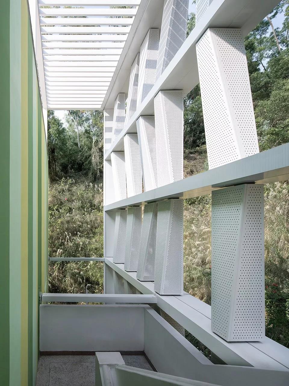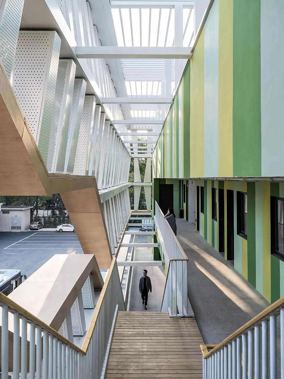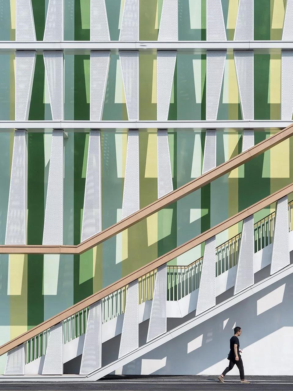 另一方面,原有的二層和三層的瓷磚墻翻新成涂料墻,四種綠色形成的豐富條形圖案與周邊的綠樹(shù)相得益彰。而白色的幕墻立面讓建筑保持謙遜的姿態(tài)的同時(shí),內(nèi)側(cè)的綠色外墻透過(guò)幕墻若隱若現(xiàn)。