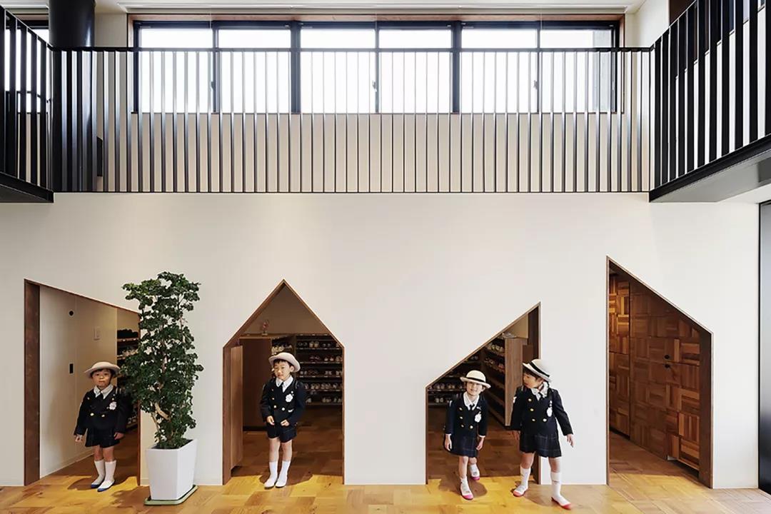 ▼幼兒園入口,兩側墻壁開有不同幾何造型的門洞
