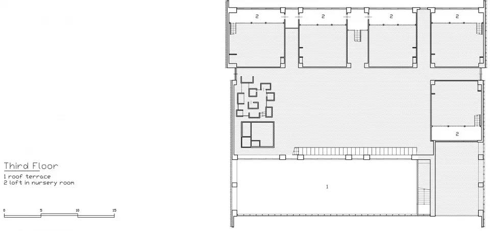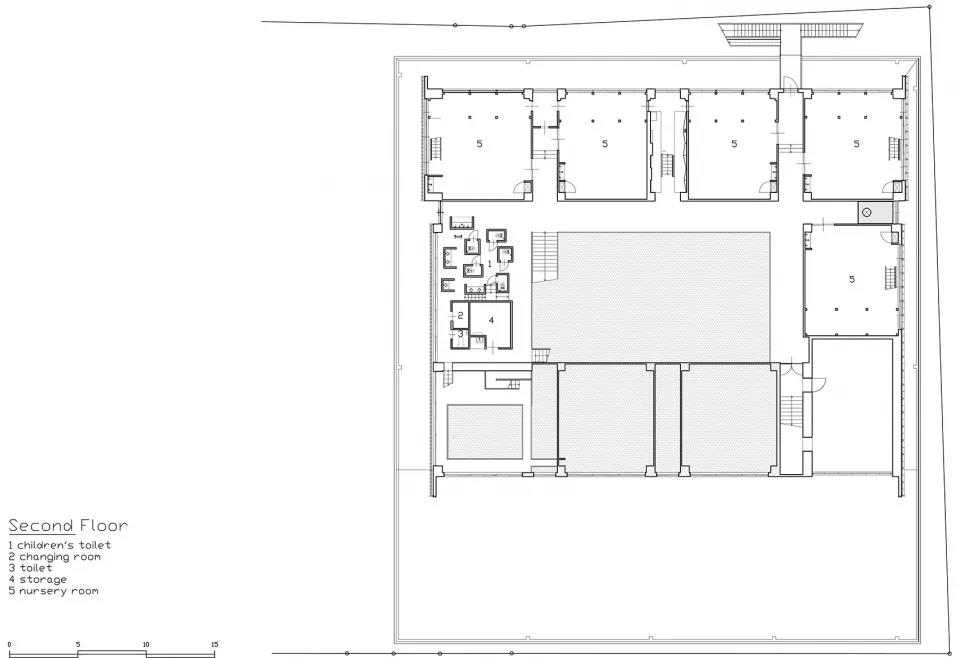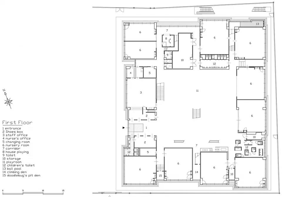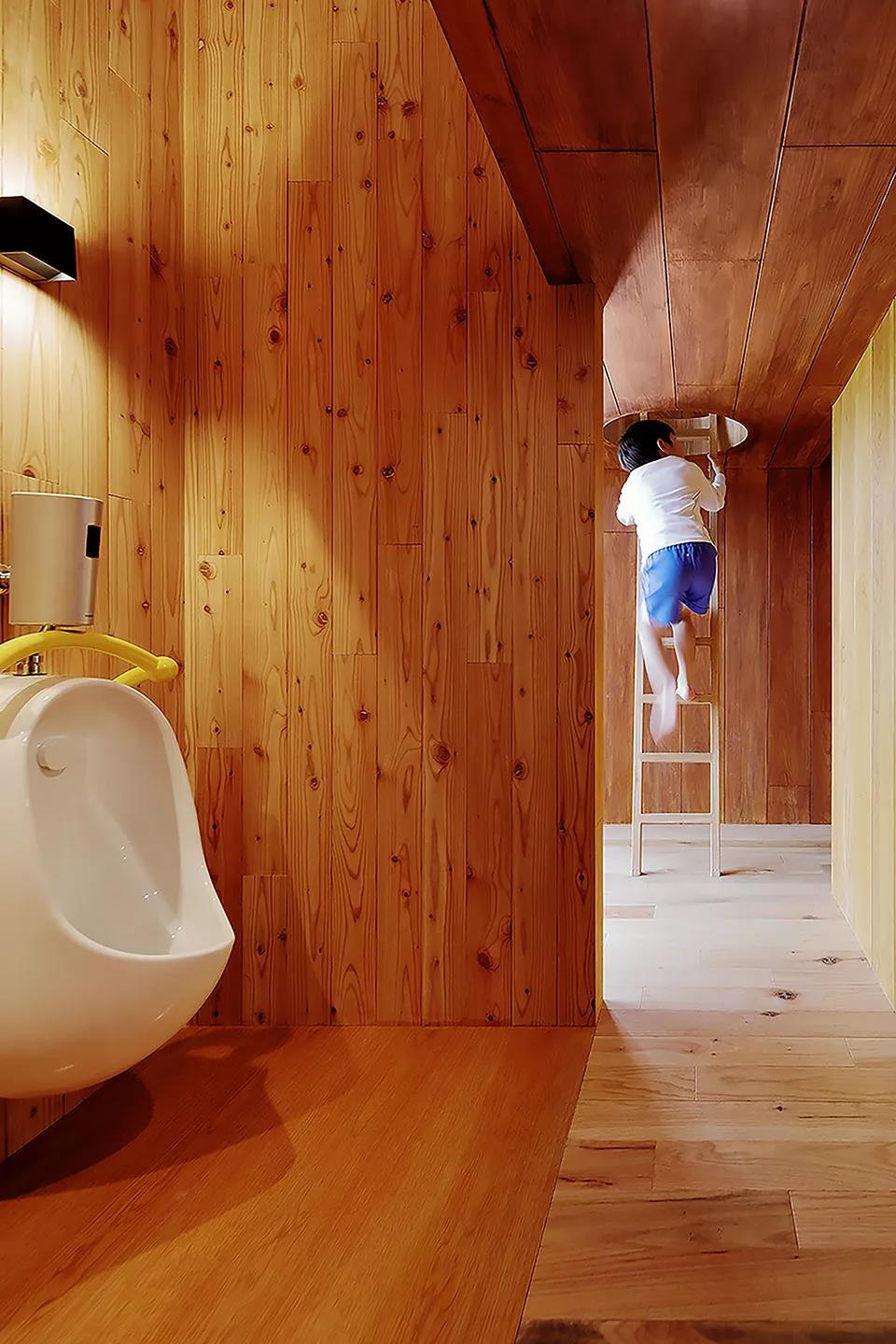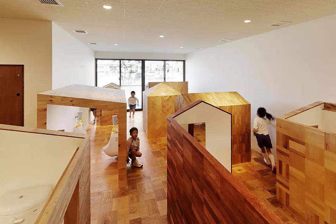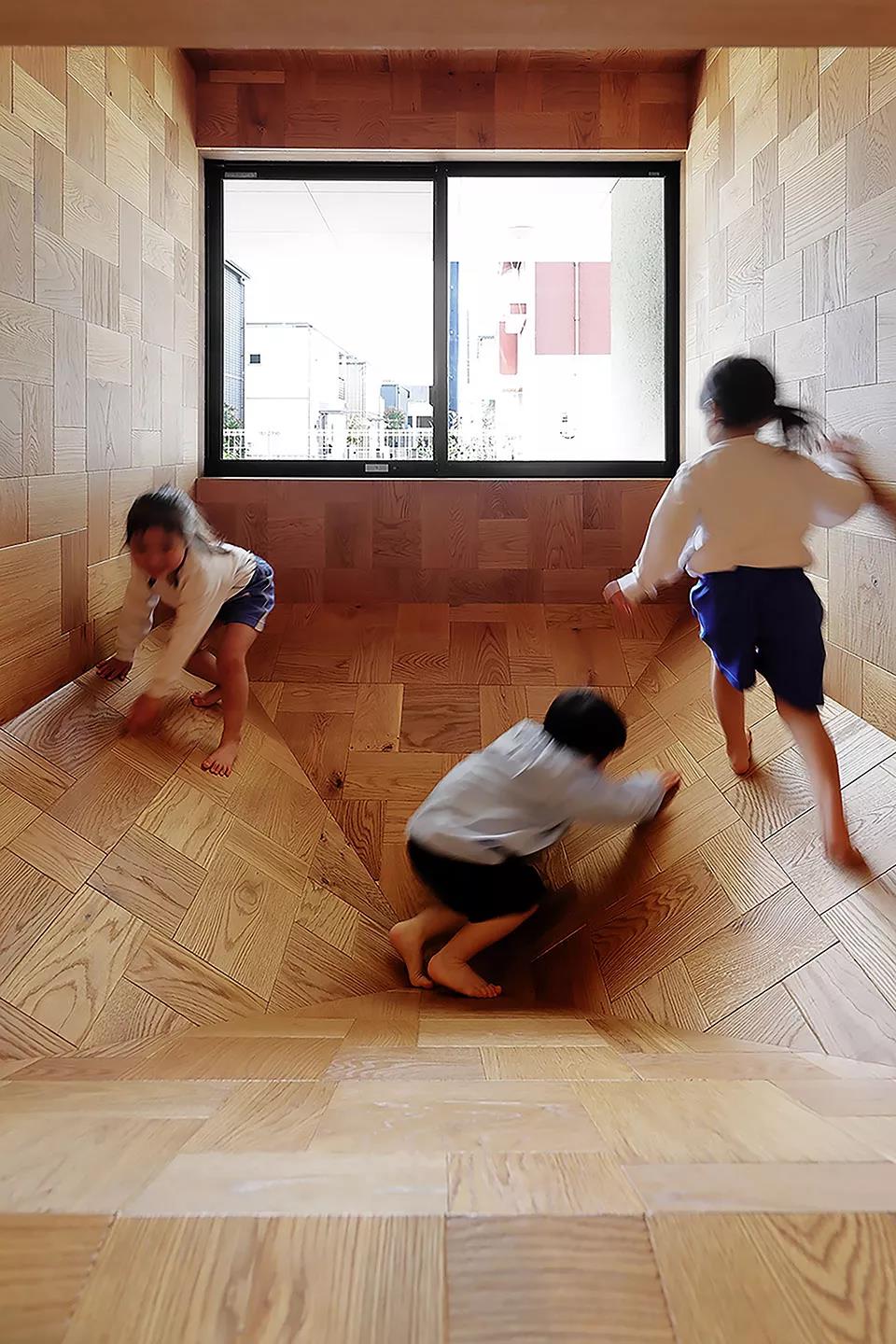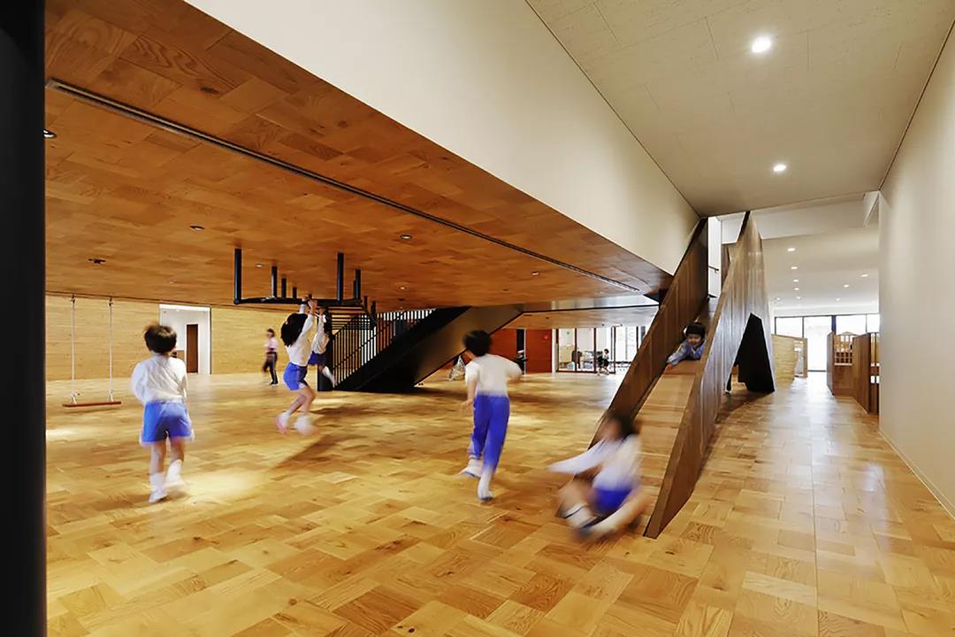 設計故意將職員室和保育室等空間上下左右錯開,富含變化的空間設計使得新的空間被創造。以孩子們游戲的原風景「路邊」為形象,在園舍中設置了14個游戲場所。