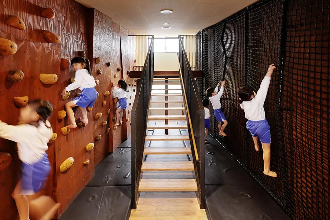 ▼幼兒園中設有攀爬網和攀巖設施