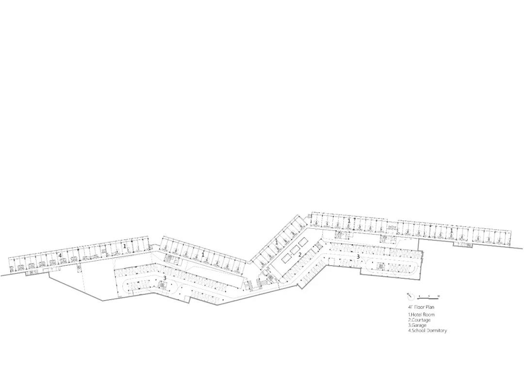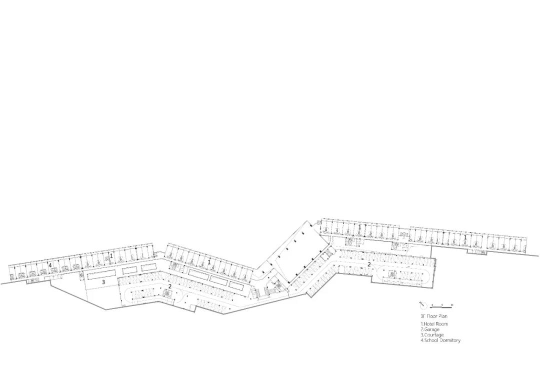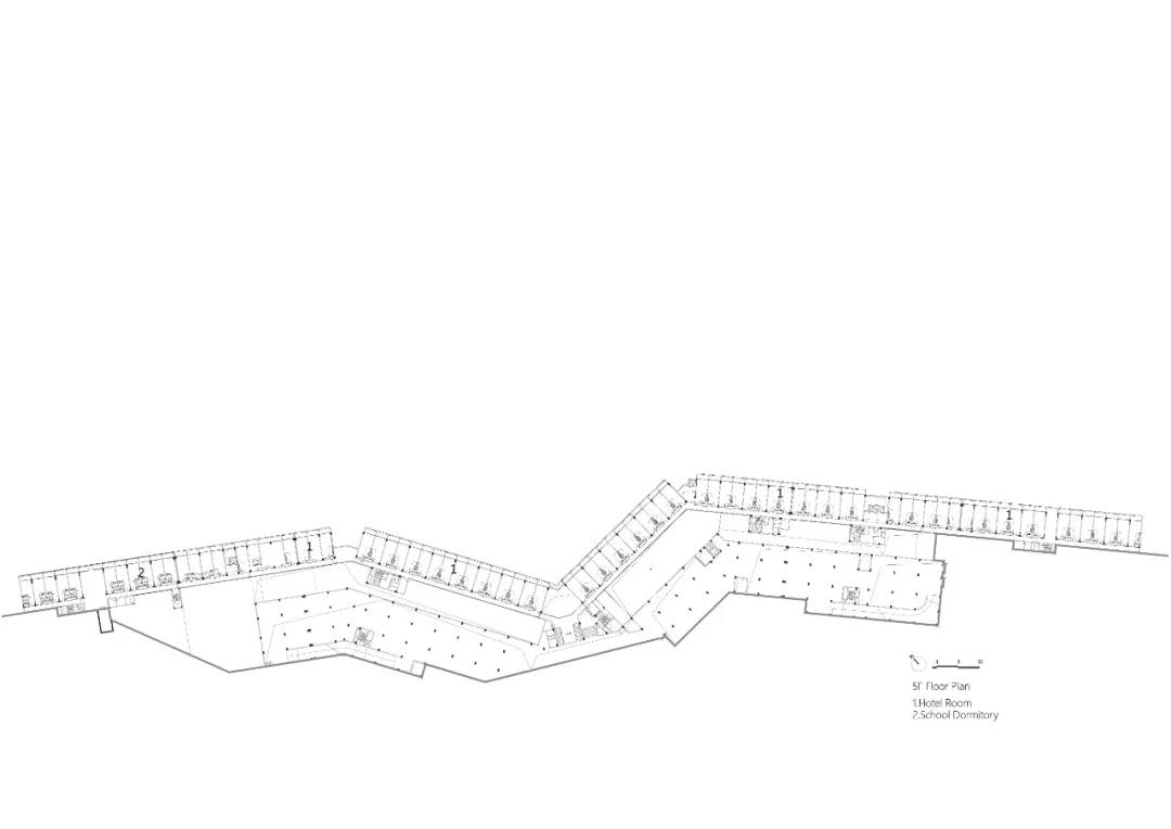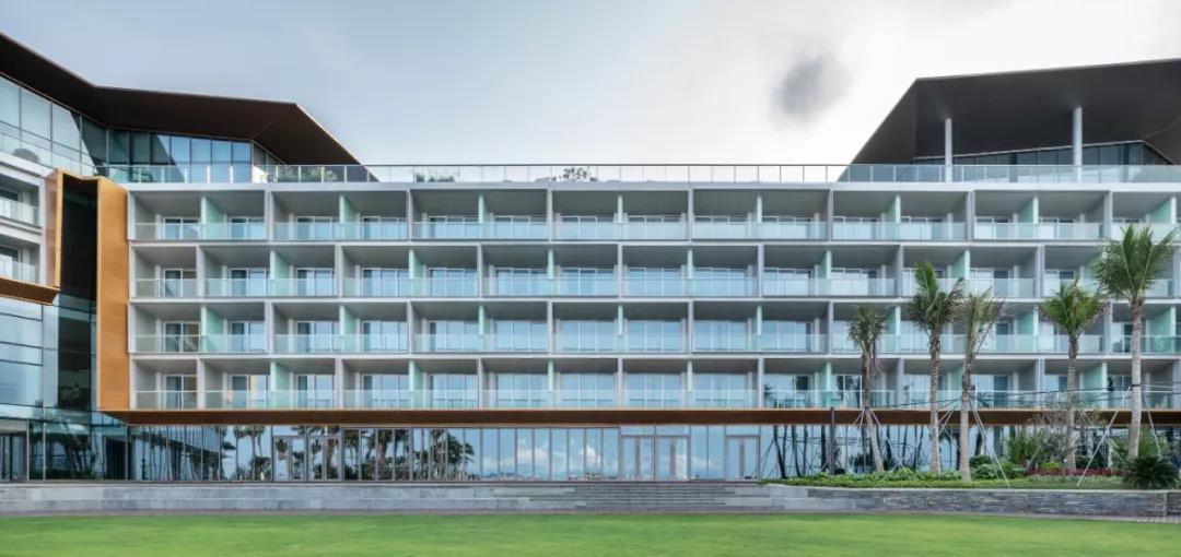 客房單元與俱樂(lè)部、餐廳、酒吧等公共服務(wù)功能之間有一條折疊起伏的“飄帶”,將公共空間與私密空間清晰的區(qū)分出來(lái),也強(qiáng)化了單元格立面與大塊玻璃幕墻之間的虛實(shí)對(duì)比。