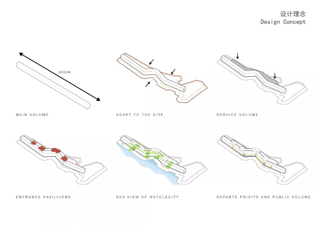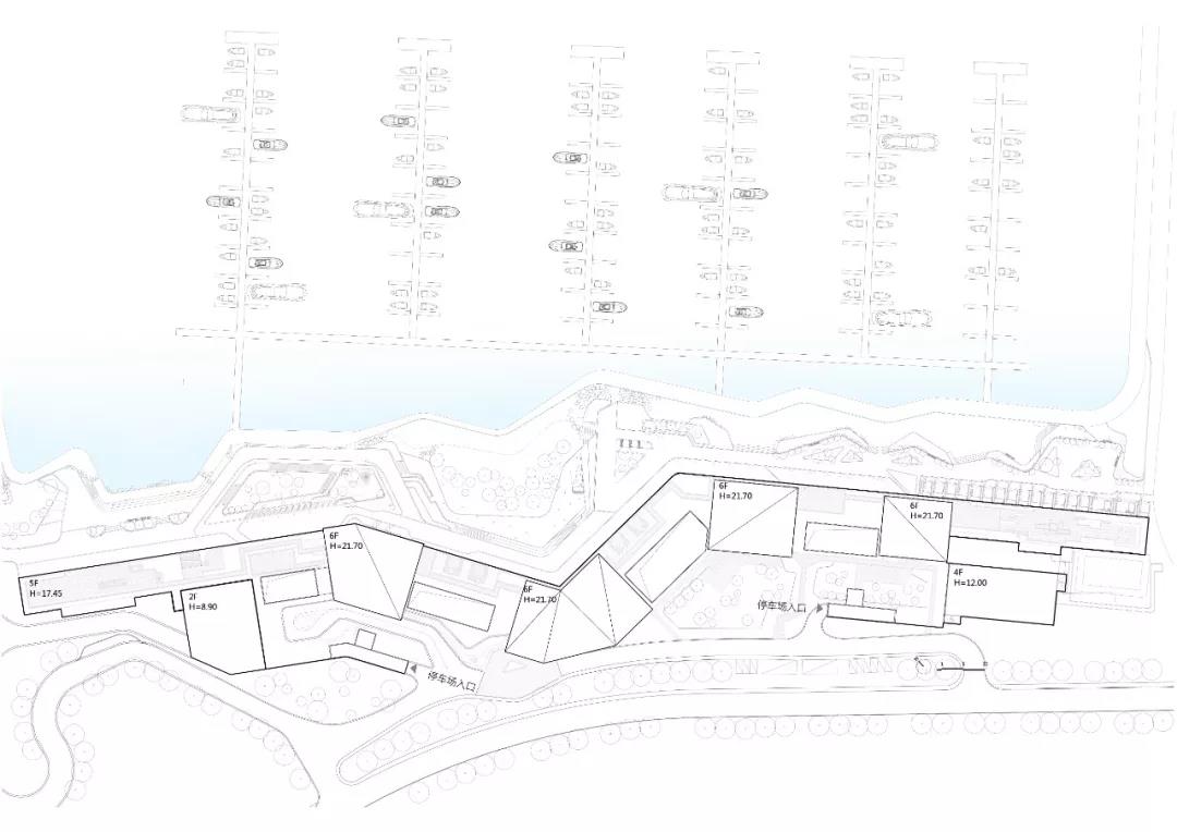由于用地狹長(zhǎng),建筑橫向排開時(shí)將形成很長(zhǎng)的“墻”。我們希望,不要由于“墻”的落成而阻擋城市的觀海視線,而是讓游艇會(huì)與城市共享這片優(yōu)美的海景。