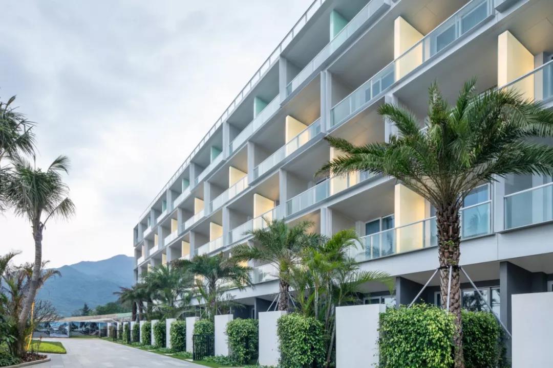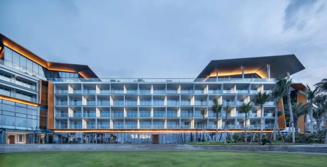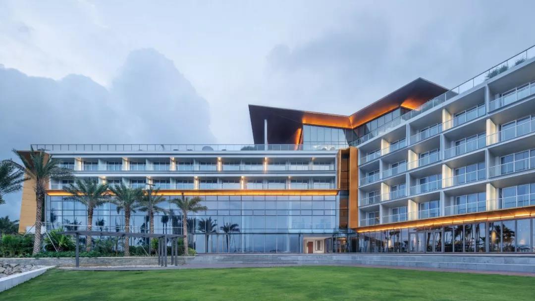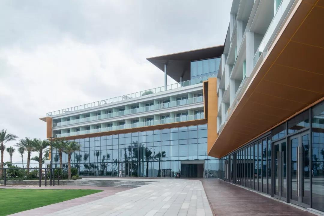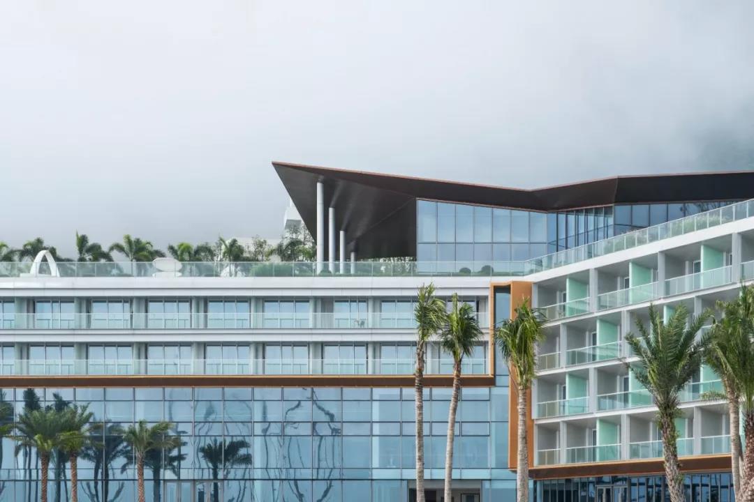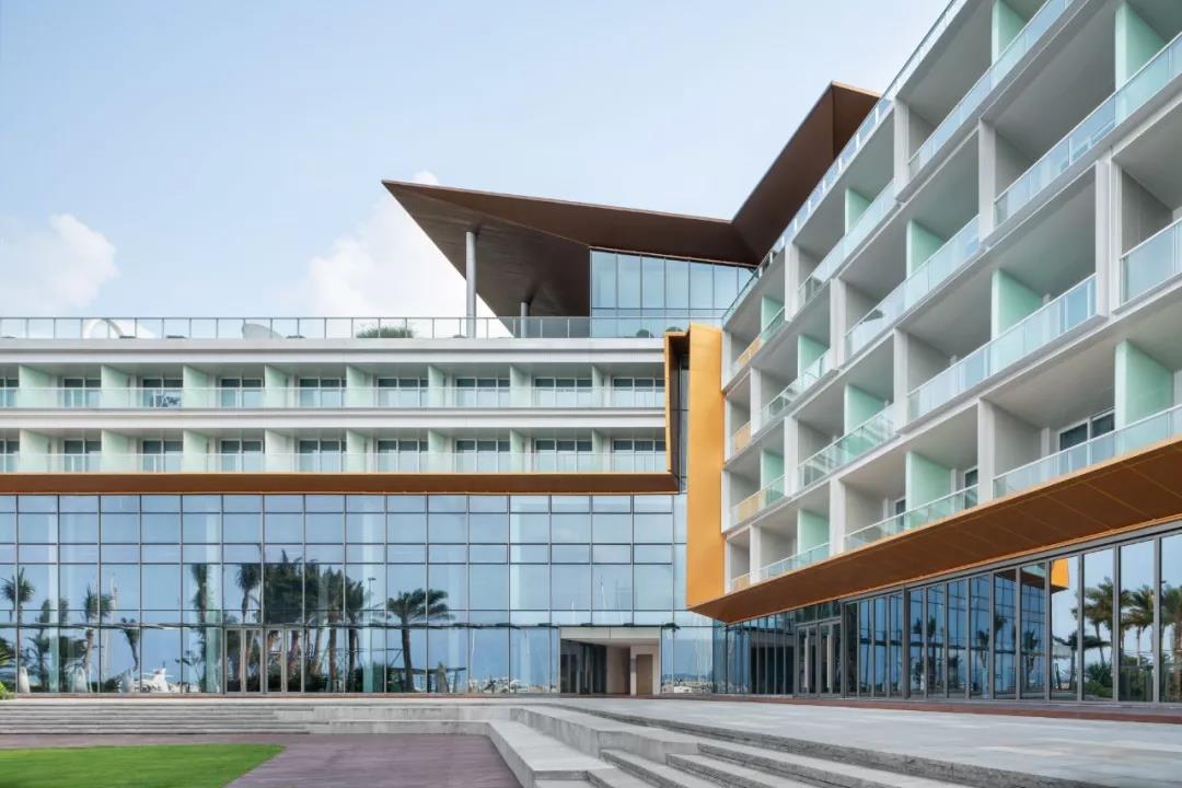 路面高度以下的建筑主體為5層,長(zhǎng)度400米,順應(yīng)海岸線彎折成4段。立面上的每2個(gè)酒店客房陽(yáng)臺(tái)組成一個(gè)矩形單元格,通過(guò)邊框的凹凸進(jìn)退,使相鄰單元格在陽(yáng)光投影、陽(yáng)臺(tái)玻璃的反射影像上都產(chǎn)生微妙的差異。單元格框體的側(cè)墻由銀白色金屬鋁板構(gòu)成;單元內(nèi)兩戶之間以雙層磨砂玻璃分隔,內(nèi)藏?zé)艄猓谝雇慝@得柔和生動(dòng)的照明效果。