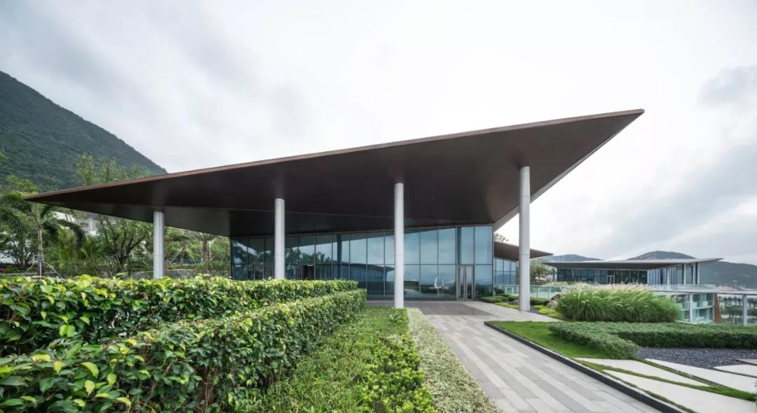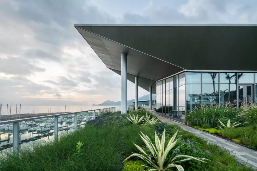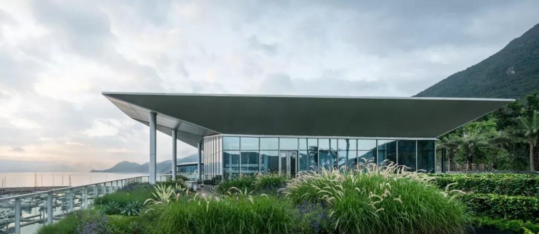 從碼頭出海回看建筑,其姿態(tài)謙遜,立面整體色彩素雅但不失局部的靈動(dòng);從背后的山上俯瞰,被綠化覆蓋的建筑屋頂和藍(lán)色的亭子仿佛消隱于山與海的環(huán)境色中,體現(xiàn)出對(duì)自然和人的尊重。