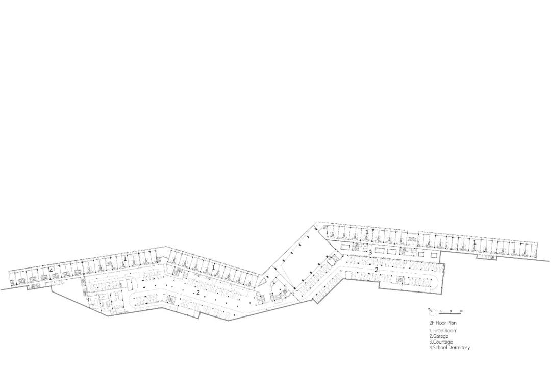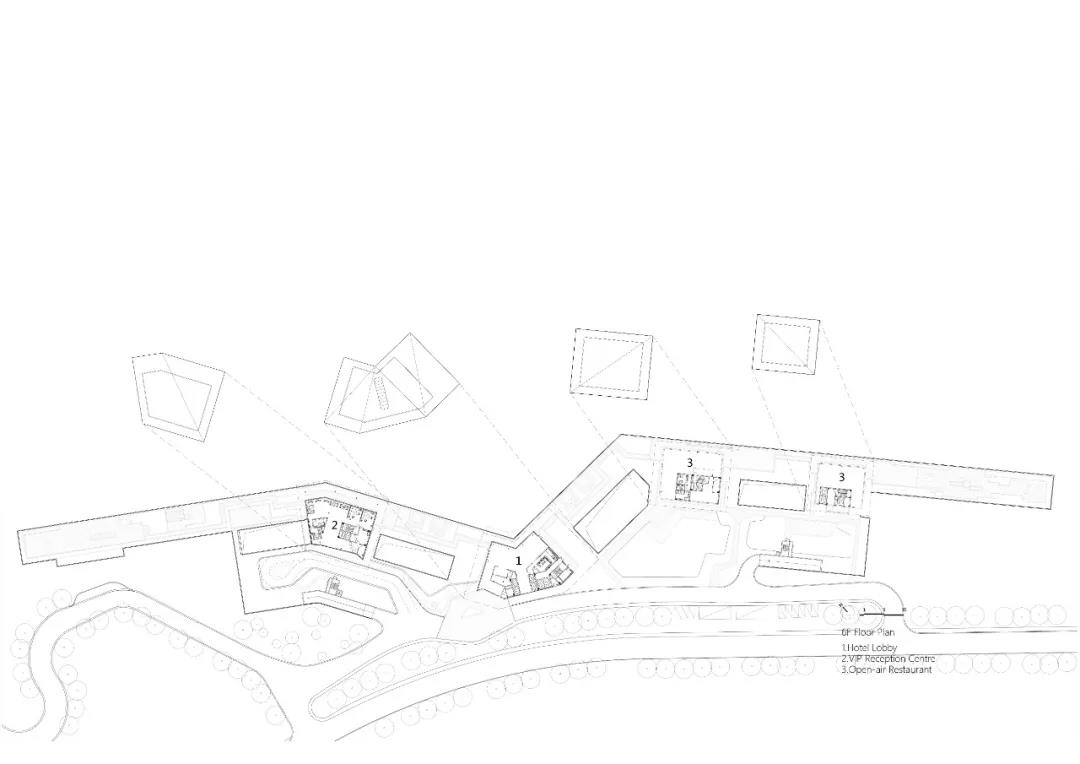 方案順應(yīng)場(chǎng)地南北高差,將建筑的主體在城市道路標(biāo)高以下解決,與路面平齊的高度上只有4個(gè)體量較小的“亭子”,其間距達(dá)40米,城市過(guò)往的人仍很容易看到海。亭子的屋頂由向四周懸挑的折板構(gòu)成,造型輕盈,為水平長(zhǎng)條形建筑帶來(lái)了起伏的天際線,也為觀海者提供了帶遮陽(yáng)的休息空間。