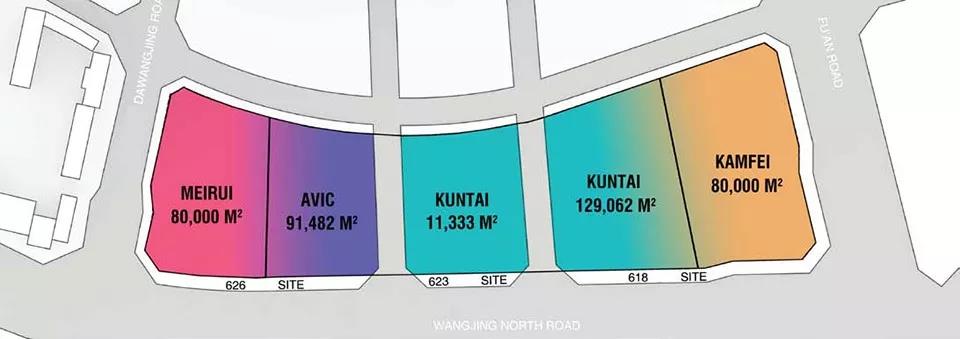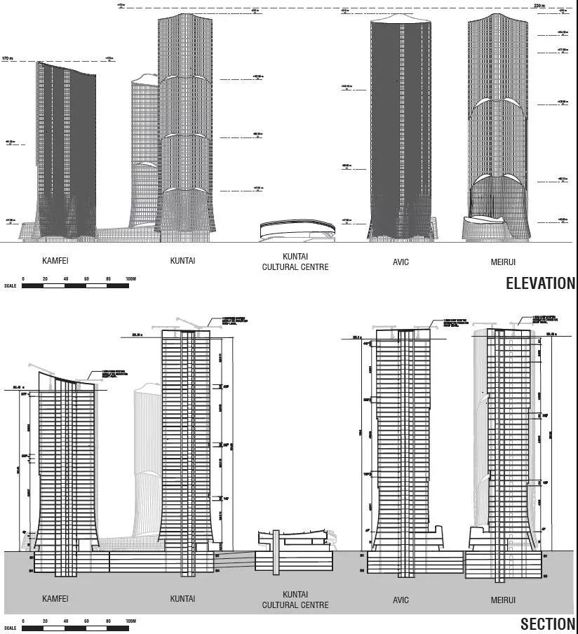 項目包含三個地塊、四位業主、五種業態,挑戰難度不小。設計將建筑按照2-1-3的數量依次從東至西排布,東側為兩座高層辦公樓,中間地塊為包含頂部城市公共綠色空間的商業會展大樓,西側地塊為兩座高層辦公塔樓和一座高層公寓。