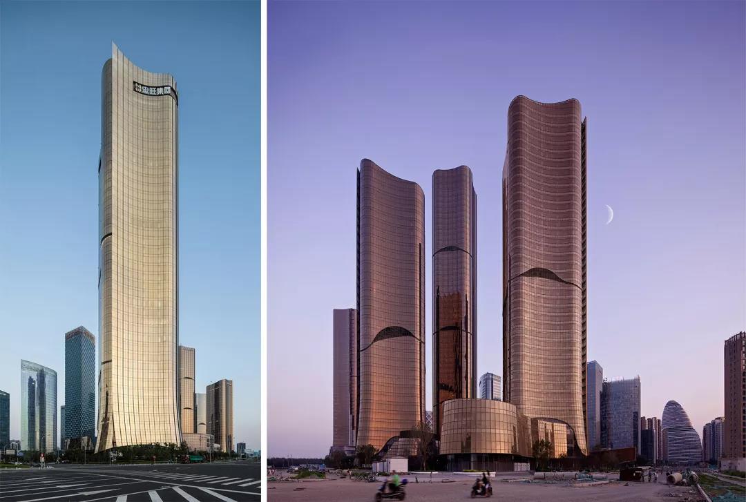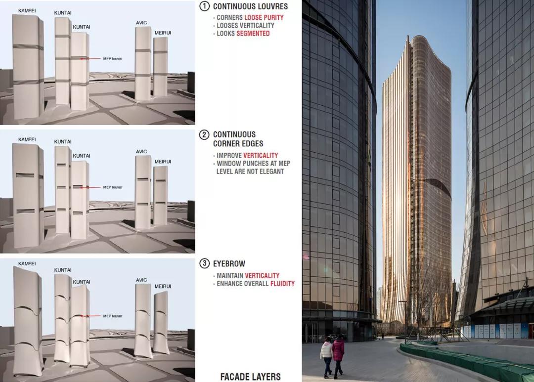 考慮到整體視覺效果,設計給樓層較少的塔樓增加了兩邊連續立面,以垂直的線條描繪樹柏,增加了塔樓的修長感,塔樓與裙樓用模擬樹干與樹根的形態,模擬樹根的曲線,為硬挺的立面增添了一份柔美。