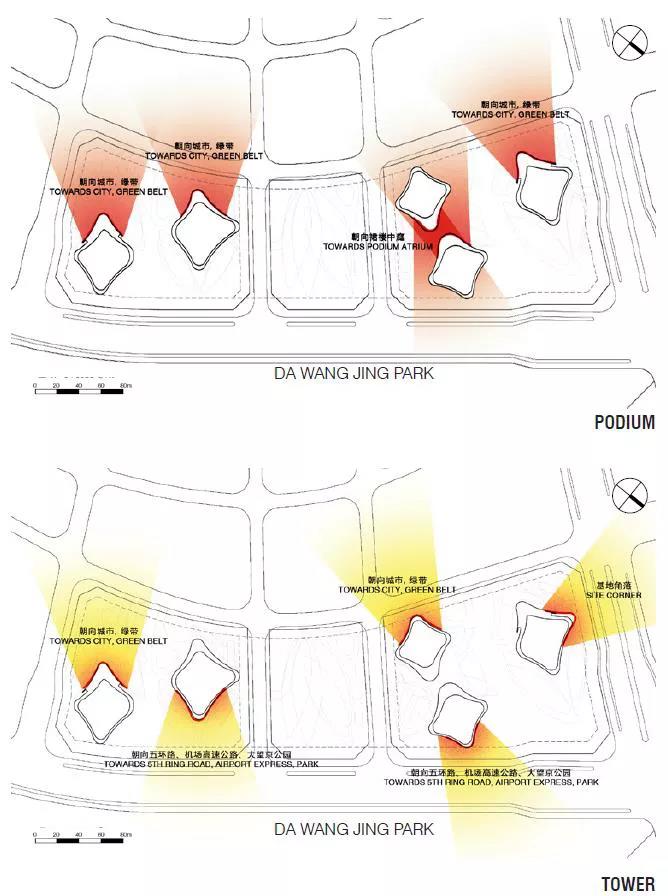 大望京綜合開發項目的成功不止于此,能夠在設計階段就獲得包括歐洲領先建筑師論壇大獎(建筑設計綜合建筑榮譽獎)、亞太房地產獎(中國最佳高層建筑5星獎)、A’設計(建筑、樓宇及結構設計金獎)獎等在內的多個國際獎項,建筑輪廓的設計也是一大亮點。“我希望它們都能夠沐浴在光線中,像竹一樣,向著它應有的方向生長發展。”設計師Andrew Bromberg通過巧妙地布局,讓建筑群從五環沿線、機場輕軌又或是其他方向的交通干道,都可以獲得富有層次的立面展示視覺效果。