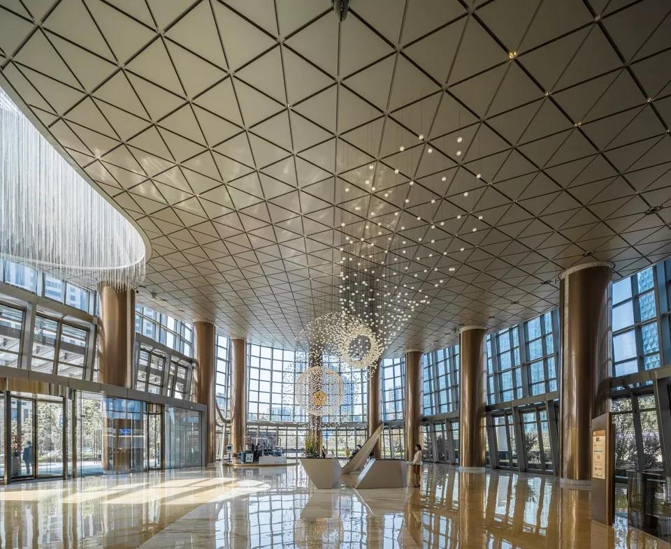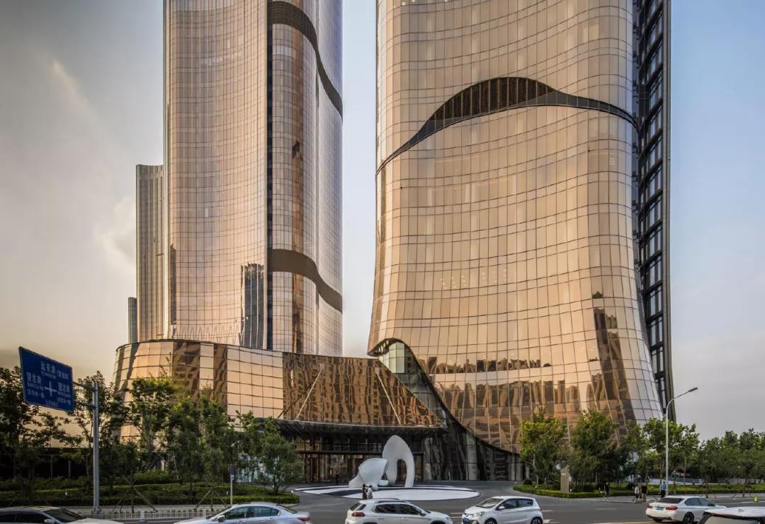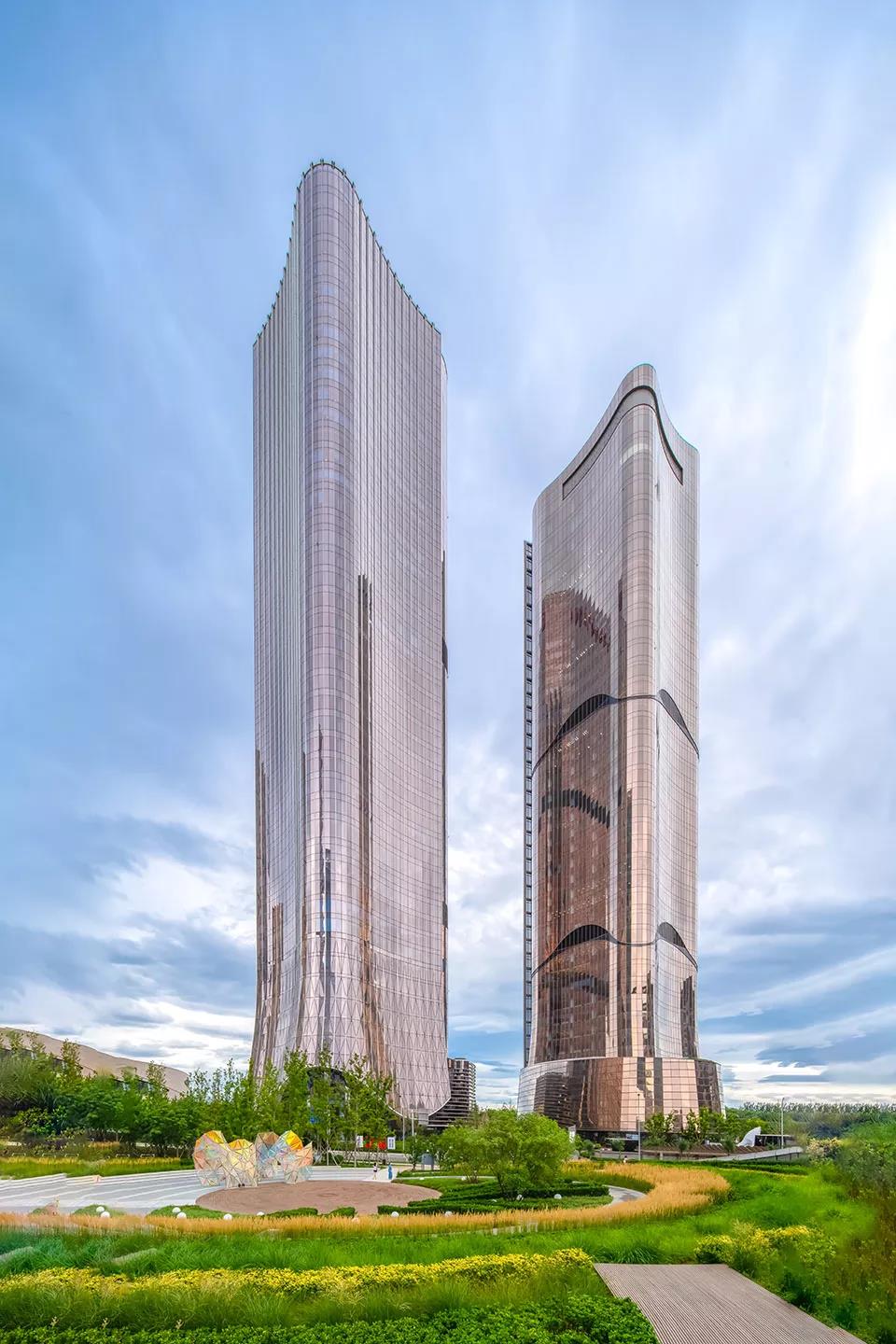 建筑輪廓則以竹與樹為藍本,以無限生機的寓意和獨特的造型打造了望京乃至北京的新地標。塔樓設備及避難層以波浪形開口模擬竹節,增強了塔樓的連貫性和整體線條的美感,用玻璃幕墻演繹下的現代都市翠竹松柏。華燈初起,立面上辦公室橙色的燈光透過藍灰色的玻璃幕墻錯落亮起,與竹節處鎏金般的燈光遙相呼應,營造出神秘典雅之感。