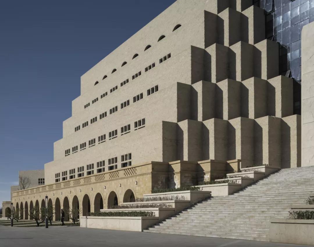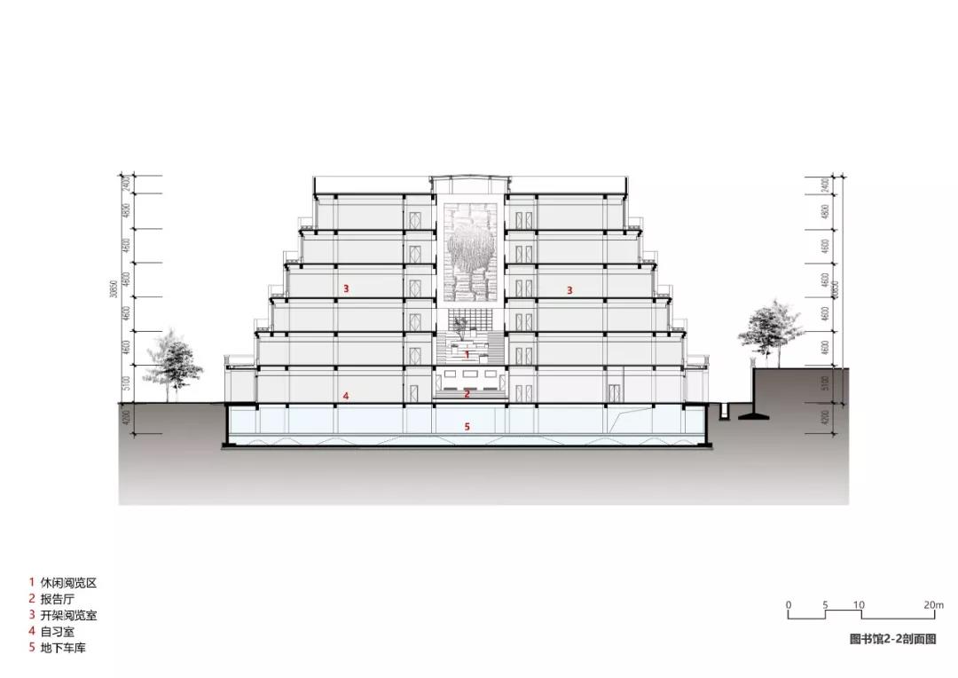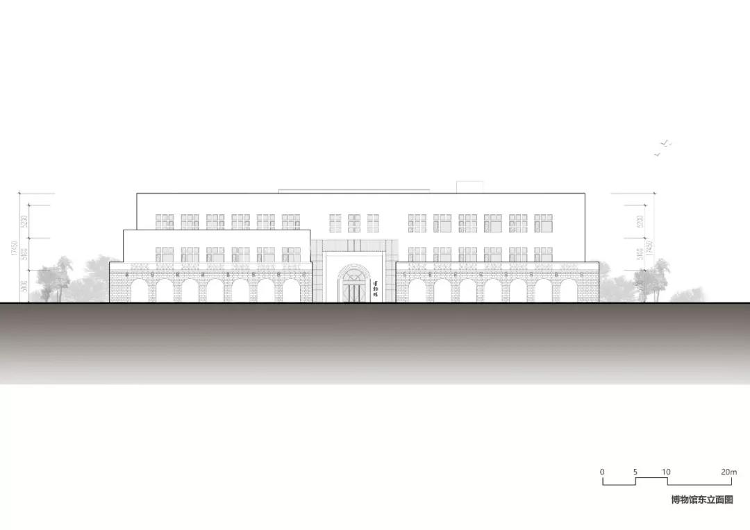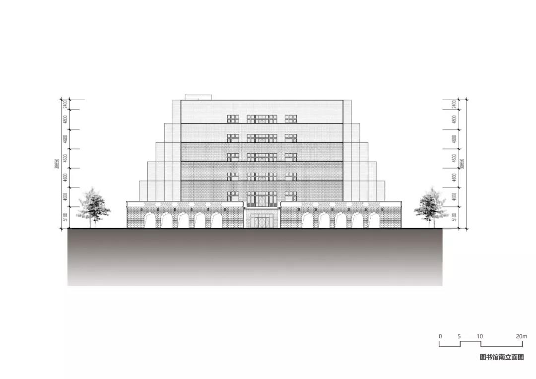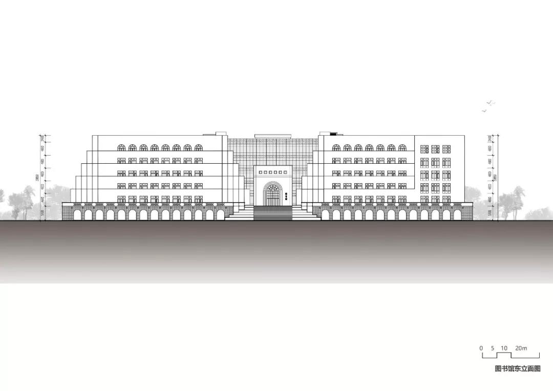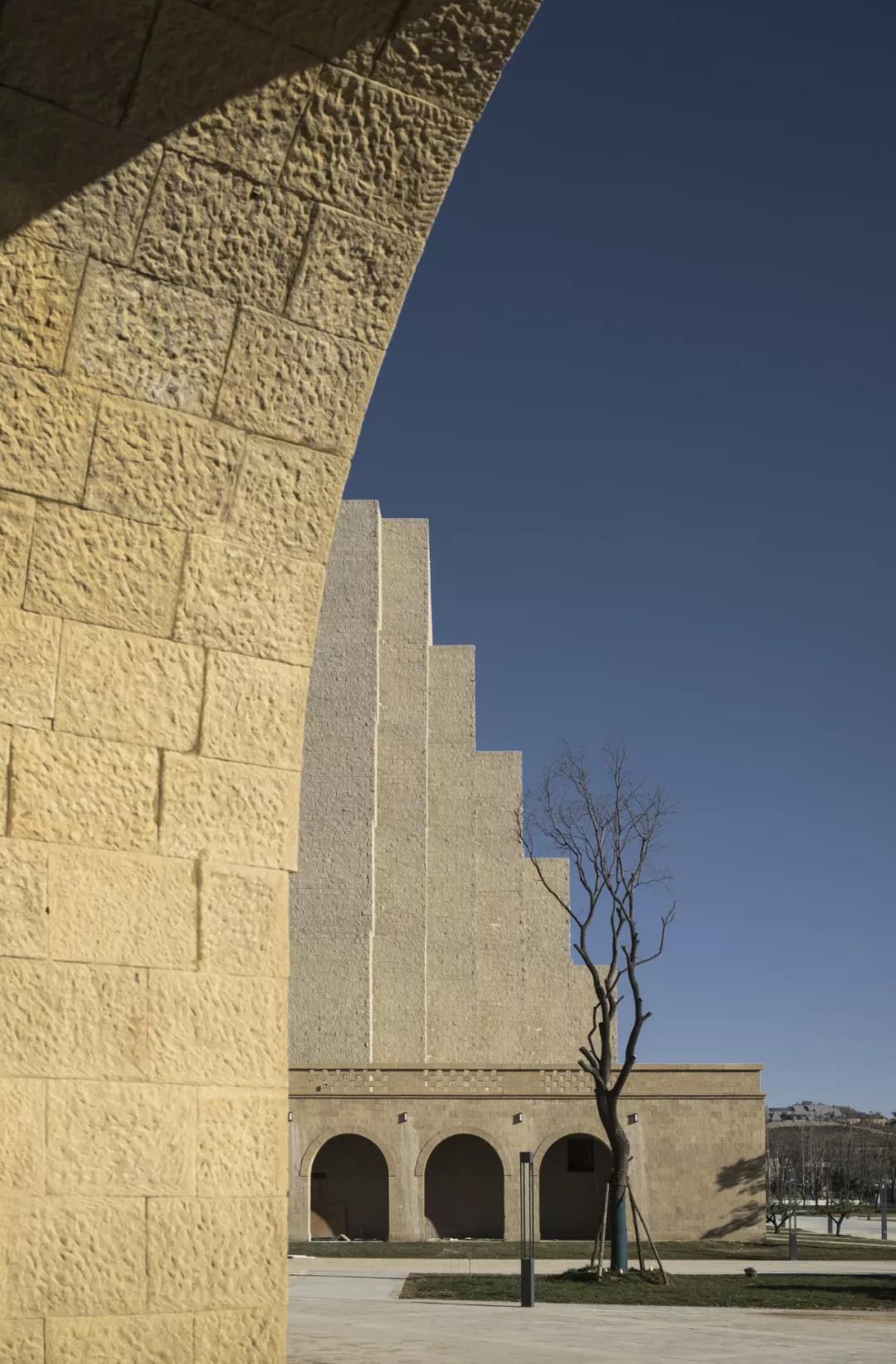 校前區主要建筑體量均采用退臺變化,作為延大新校區的標志性特色元素。窯洞符號作為延安最具特色的建筑元素,貫穿于整個校園的設計之中。但不是簡單的模仿和照搬,而是跟校園文化和實際功能需求相結合,運用窯洞符號塑造拱廊空間,既作為建筑基座,增強厚重感。