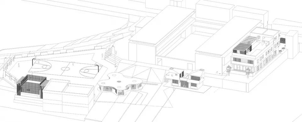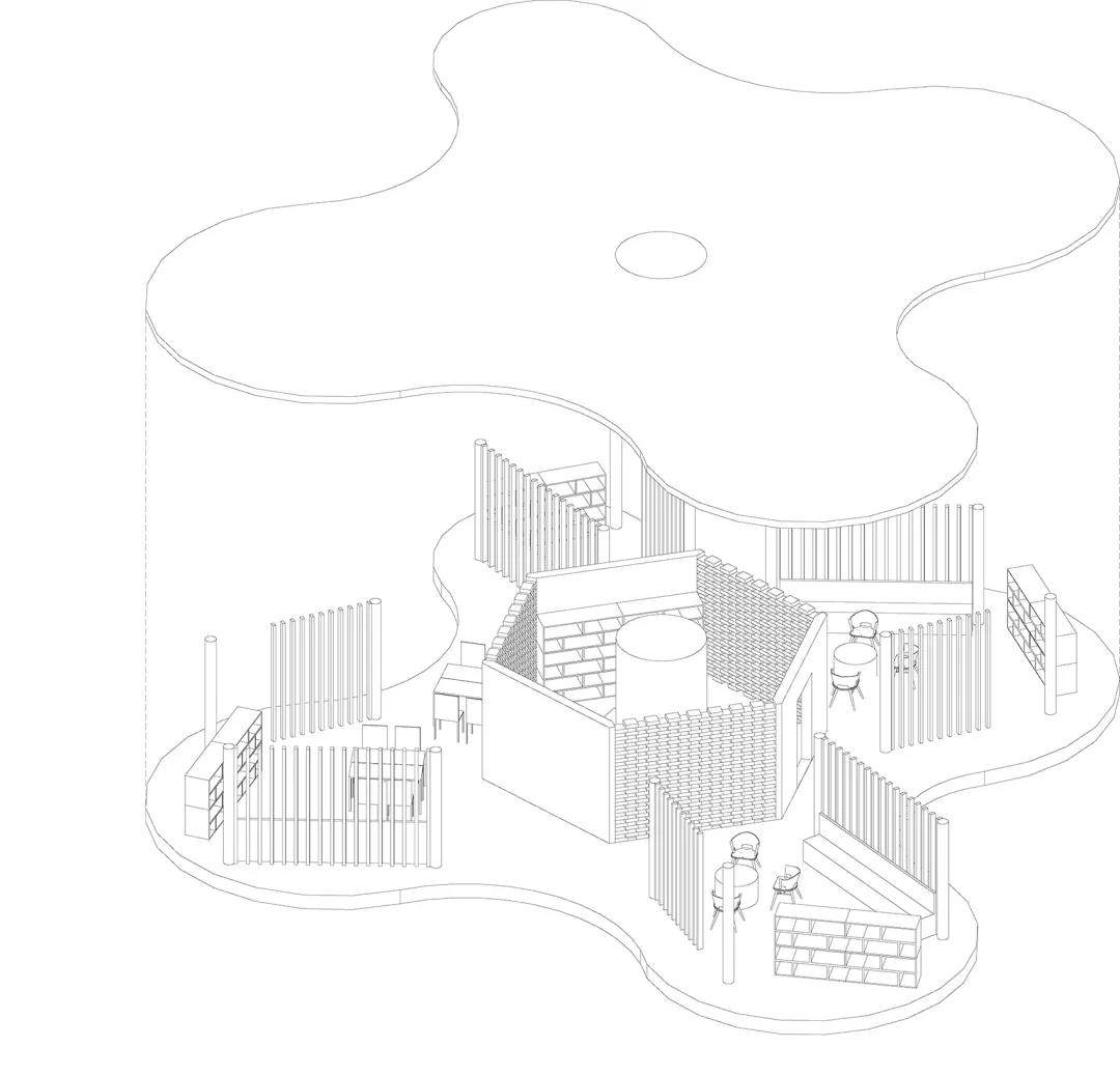 現有小學建于上世紀八十年代,僅有基礎的教學樓,而孩子們的課外活動空間則相對匱乏。我們試圖在緊鄰學校一側的草坪上創造一個新的場所,植入諸如圖書閱覽、手工制作、開放課堂等活動。建筑的形態經過若干輪的探討最終確認為一種平滑凹凸曲線的形式。六邊形的閱覽室作為核心,而活動空間旖旎起伏包裹在其周邊,如同軟體動物的數只觸手向周邊的環境伸展開去。