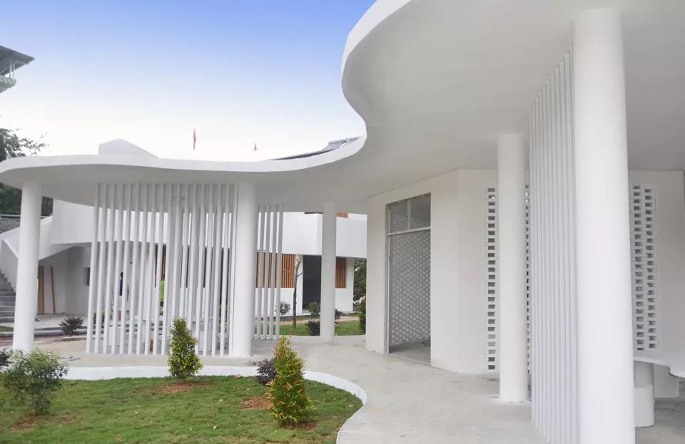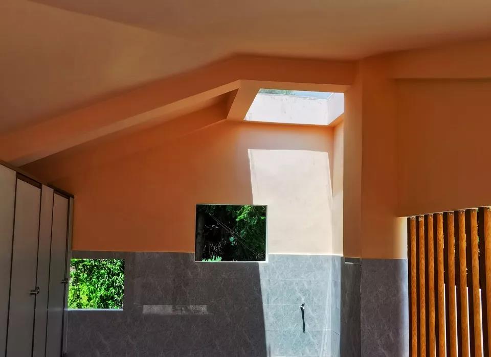新洗手間被分為上下兩層,而上層正好與學校操場的高度齊平,孩子們可以順暢地使用,而下層則被預留給******公共活動時使用,上下兩層通過樓梯連接,具有一定的“忙時”互補***。兒童洗手間被設置為男女兩個獨立空間,頂部處理成兩個相對的偏心棱臺,而內頂面被刻意地噴涂為橙綠兩種主題色彩,陽光從頂部的采光孔灑入,在墻地面上投下漫射的光影,整個空間具有了一種宗教空間般的精神氣質。