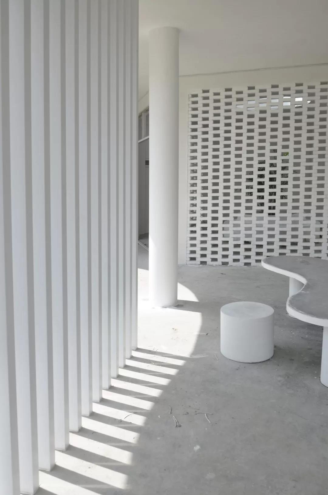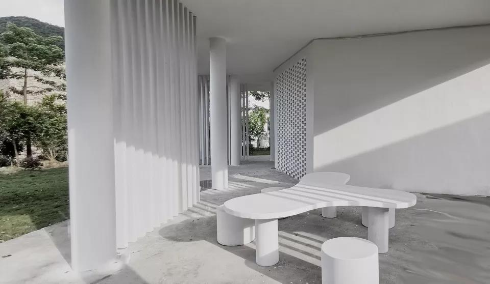 “不做無理由的形式”是我們一貫的自我要求,而此空間結果主要回應了兩方面的需求:對于景觀的最大化融入,和對于人流與活動最大程度的接納。平面方向上的凸與凹,形成對景觀或“浸入”或“收納”的關系,垂直向度的元素僅有結構的圓柱和少量作為“虛隔斷”的白色格柵,它們一種相對隨機的位置出現,雖然賦予空間一定的邊界,但更大程度上放任了其中活動的自由。