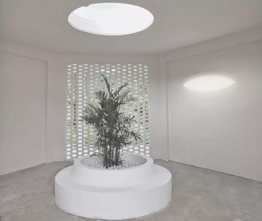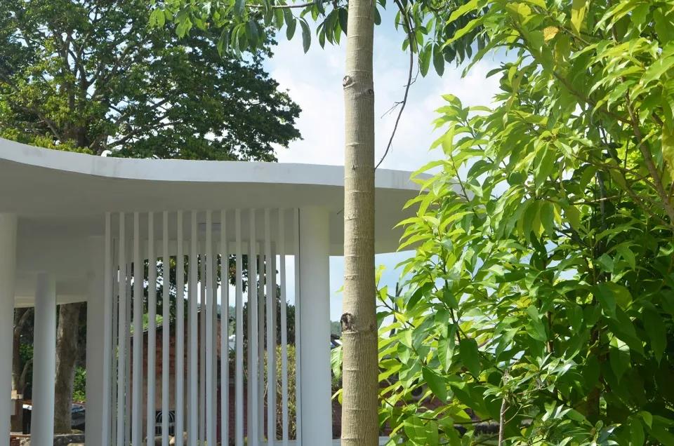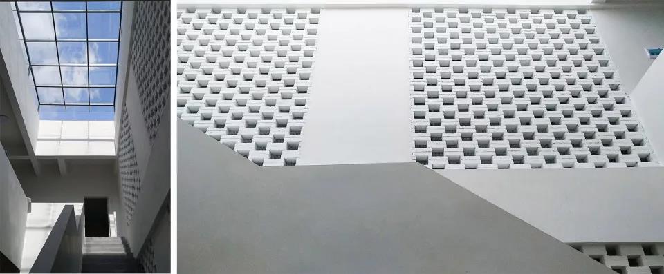 建筑共分三層,首層為辦事大廳和村民活動,二層為村委辦公及會議室,三層為黨建工作室,所有空間均圍繞中庭展開。而封閉與開敞空間的交替出現形成了富有韻律感的序列。中庭外墻一側被處理成花格磚的肌理,頂部天光徐徐落下,映照在鋪滿白色卵石的花壇中,樓梯從竹叢中扶搖而上,整個空間呈現出一種寂靜、悠遠的氣質,而這種氛圍是其他同類行政建筑中非常罕見的。花壇中的竹叢也強化了場所的文化氛圍。