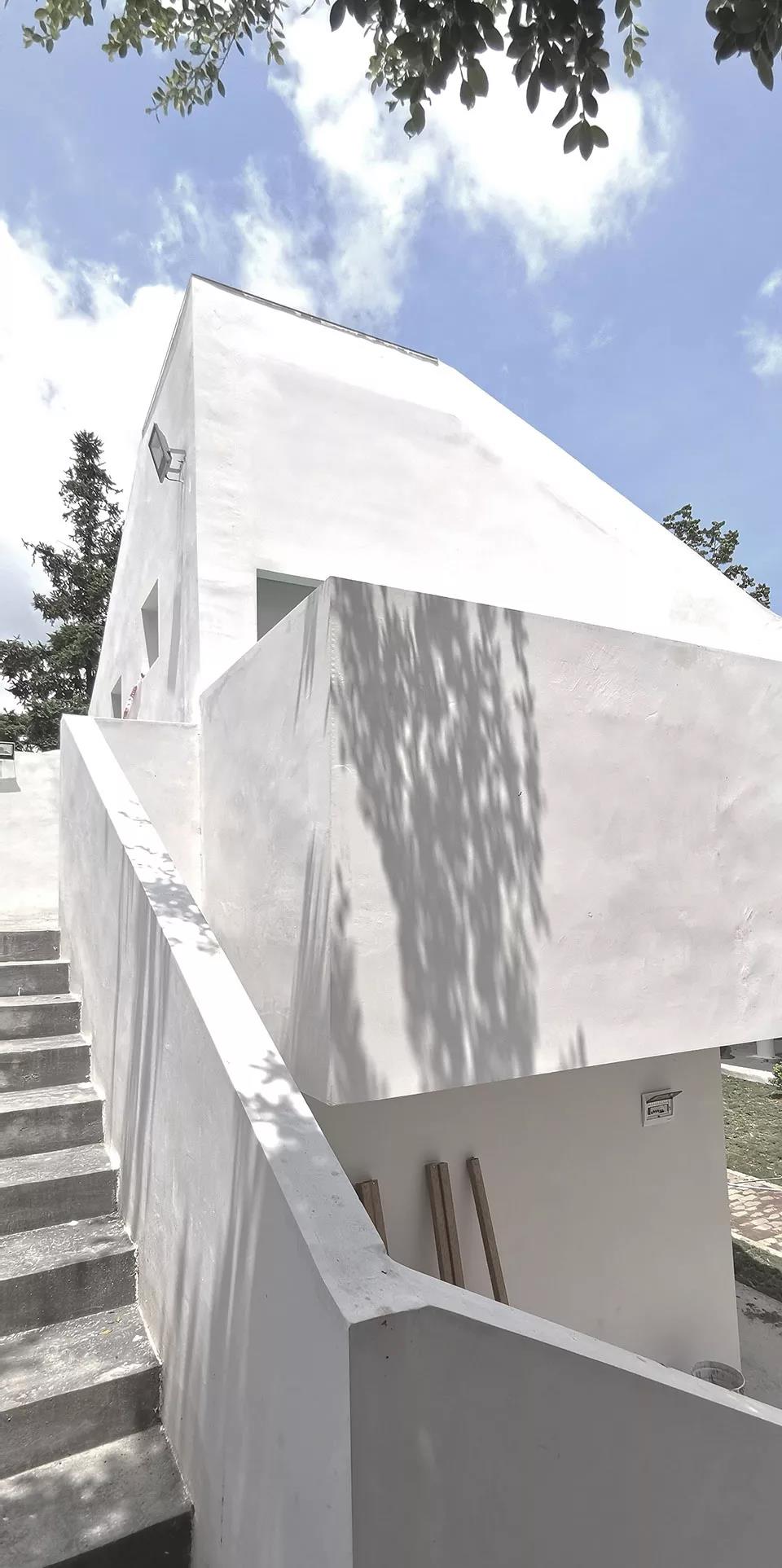 在保證私密***的前提下,外立面被處理成半高的陽臺與格柵結合的形式,打破傳統公廁全封閉的刻板印象,讓光線的舞動更加微妙,同時外挑的陽臺形成可以放置花草的休閑空間。如廁的行為不再只是一種生理的需求,它被拓展成可以短暫放松的游戲空間,立面上打開的數個不規則洞口,滿足了孩子們向外張望的愿望。