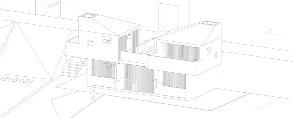 場地本身的局限也是明顯的:用地范圍是一塊面寬10m、進深25m的狹長地塊,短邊臨街,而兩側分別緊鄰學校和民宅。如何在有限的條件下實現有品質的場所?我們確立了以一個狹長天井作為空間核心的策略。