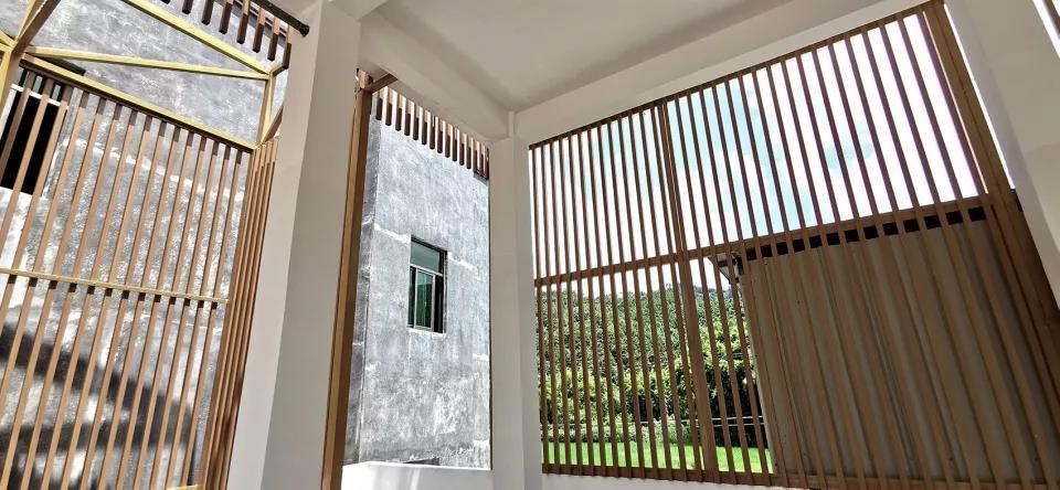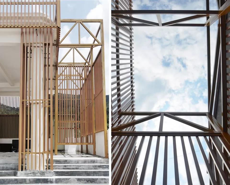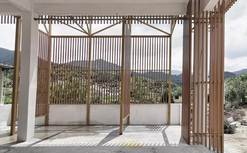 戲臺的頭部被拔高、放大,中間形成高聳的主舞臺,而兩側以若干桁架形成序列感的多重進深空間,原有的柱子、舞臺四周和桁架底部均被垂直向的木格柵覆蓋,以一種較輕盈的方式塑造了主舞臺和側臺結合的古典戲劇空間。儀式感被增強的同時,大量格柵的空隙,讓建筑周遭彌漫著一種“空氣感”,背后的青山仍隱約可見。