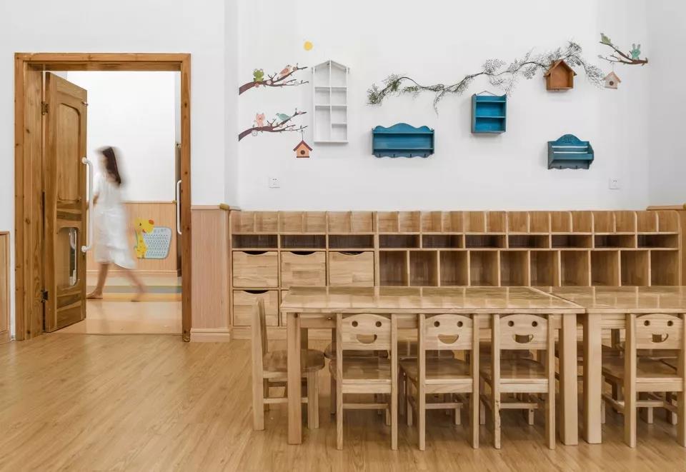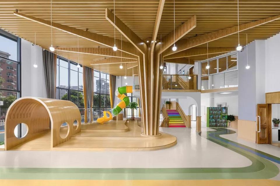 項目改造前原建筑窗都是大落地窗,保證充沛的陽光,依靠空間的層高優勢,利用貫穿空間的大樓梯,劃分出更多可以用來發展兒童天性的自由探索空間,一樓接待大廳作為孩子們進去室內的第一空間,地面為PVC地塑材料,一條跑道將公共空間和教室連接起來。大廳保留原有的圓形柱子加以“樹”的抽象造型修飾原建筑柱體,室內空間主要以白色、木色為主,樓梯閣樓處挑出空間用平臺與滑梯連接一樓的活動空間,增加“樹”與“樹屋”的空間趣味性。用簡單樸實的設計向孩子們展示出設計者和教育者的可持續性環保理念。