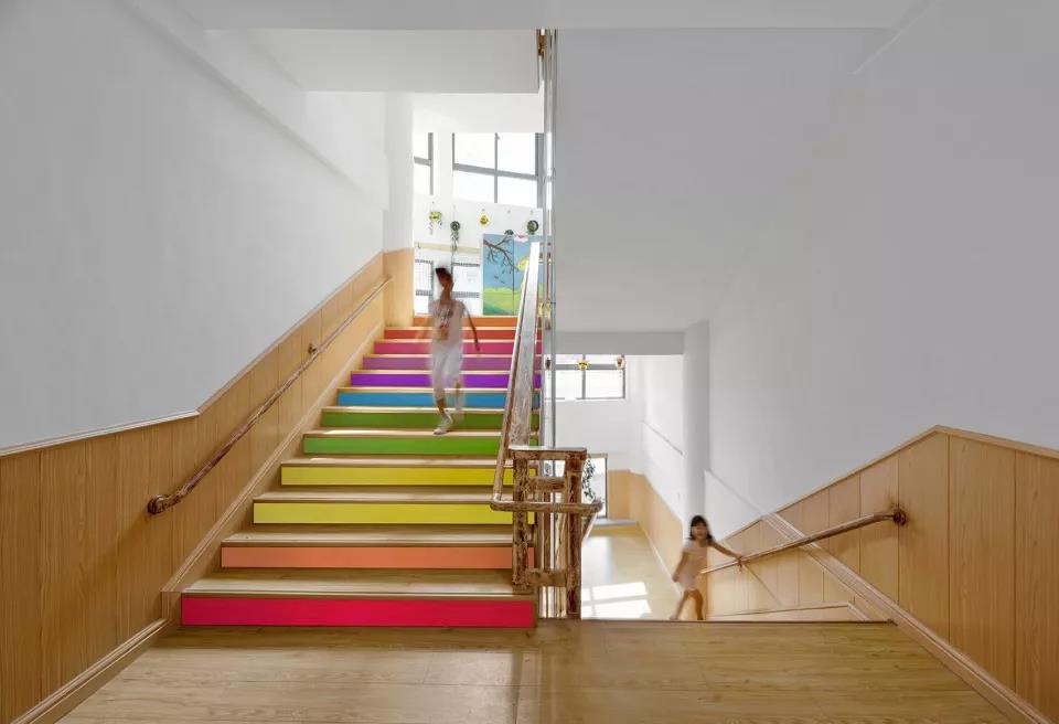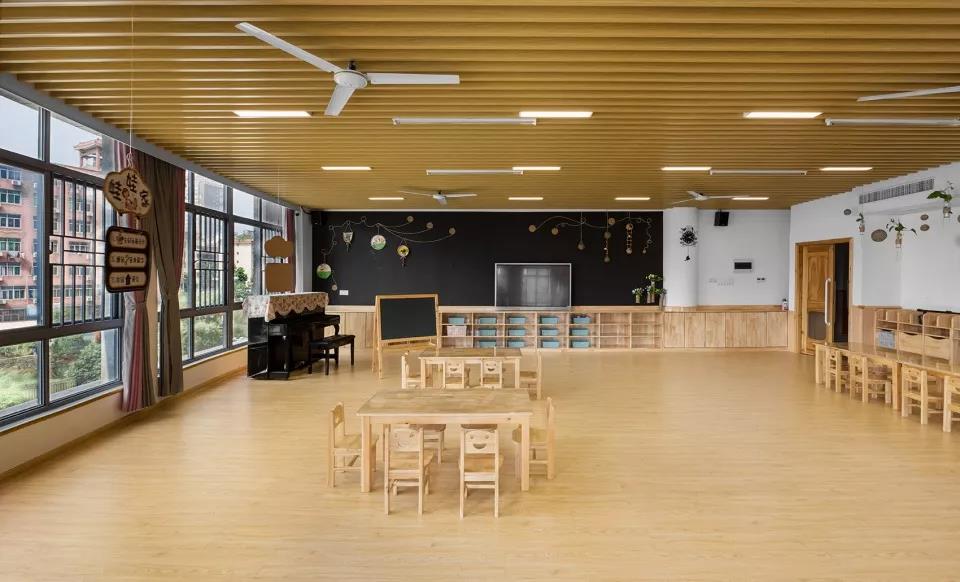 每個教室營造出一個小型演出或集體活動的空間。通過對空間的靈活化使用,在功能上對不同空間進行定位,豐富幼兒教育空間的教學內容,滑梯、兒童閱讀平臺、開放式兒童烹飪臺、整面涂鴉黑板墻設計及角色扮演區等分段式穿插在空間內,豐富的室內活動區域,不僅可以誘發兒童的探索心理,也讓他們可以自由選擇,根據自己興趣愛好去探索。