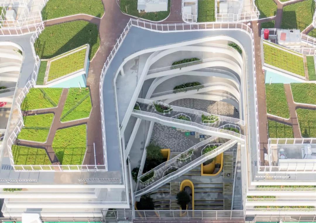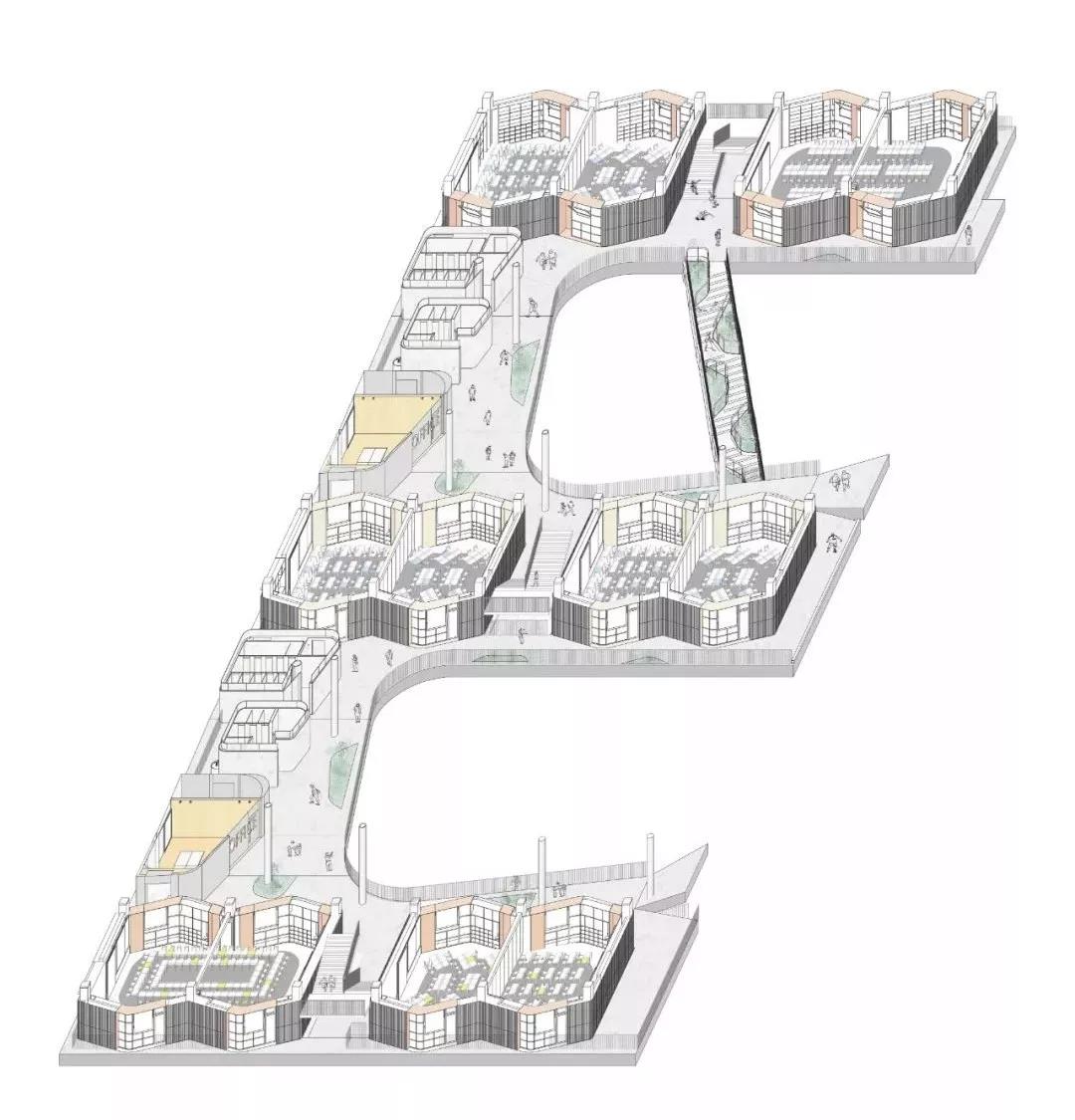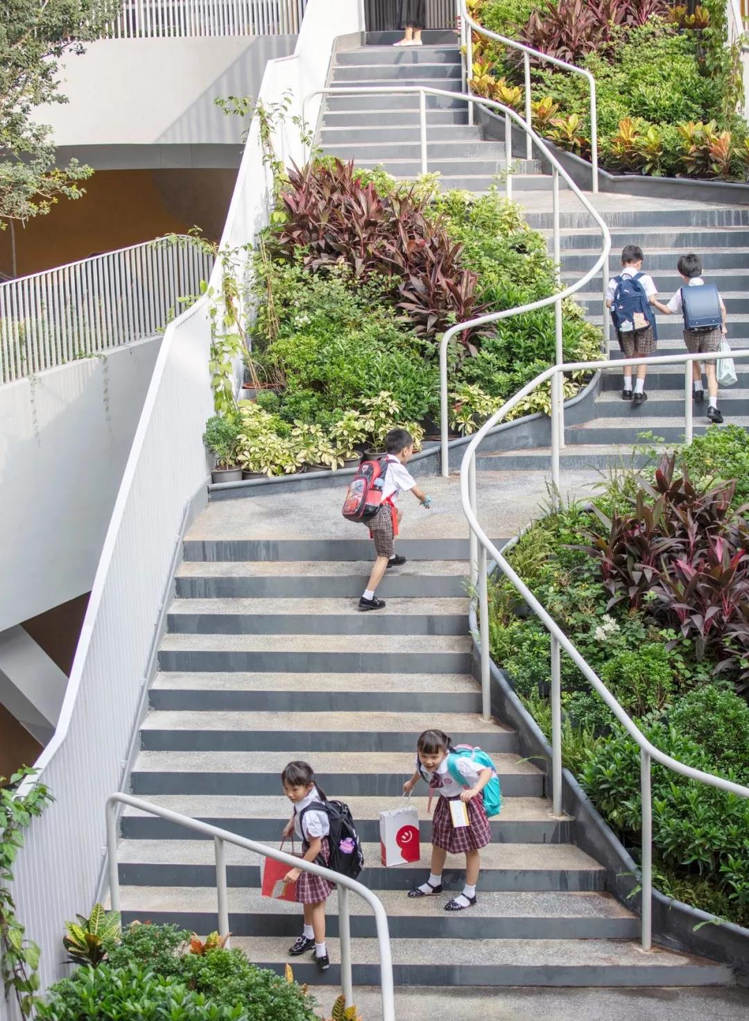 建筑師利用了場地北高南低的條件讓每層的三排課室從南往北各有一米的高差,在E形平板上產生了爬升的地景式行進體驗。最終,兩個“山谷”庭院中各有兩道連接庭院兩側不同樓層的階梯式花園廊橋,在“山谷”的上空懸置了一份獨特的觀賞和游戲體驗。