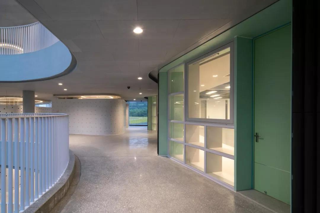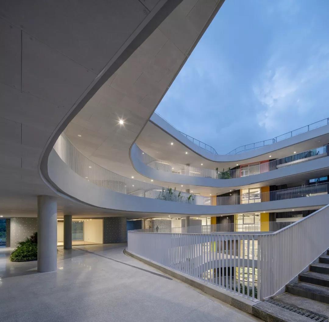 鼓形平面展現出比傳統矩形學習單元更大的靈活性與自由度,更有利于單元課室里面的多樣化的教學模式。課室經過連接后產生的富有韻律的折曲線與各層樓板在內庭院一側的自由曲線間形成的線性活動場地,為小朋友們課間提供了一個富有活力的半戶外活動場地。