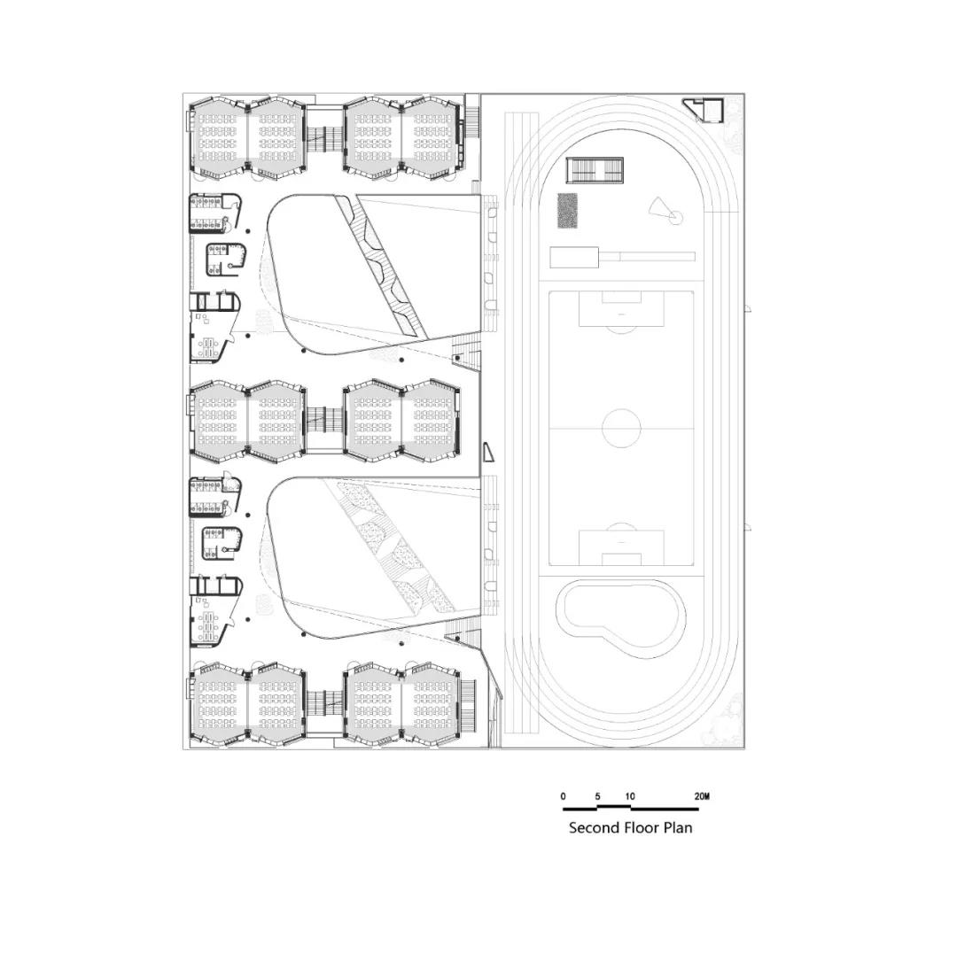 下沉庭院通過緩坡和露天階梯劇場與架空且自然起伏的首層地面連接成為一個整體的地景兒童樂園。200米環形跑道和運動場被置于建筑東半區三層屋面,與西側主教學建筑的三層平面相連,便于在二、三、四樓上課的小學生們課間到運動區域活動。