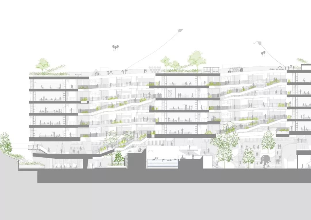 “山谷”庭院、上下錯動的水平層板、疏松的細胞組織以及有機的綠化植入系統均是項目中回應高密度和亞熱帶的南方氣候的建造策略。而更為重要的是,建筑師希望通過紅嶺實驗小學的建造過程和結果進一步探索高速發展之后的高密度城市里公共性設施的全新空間范式。