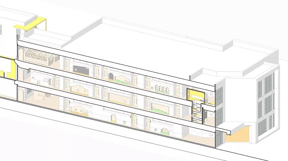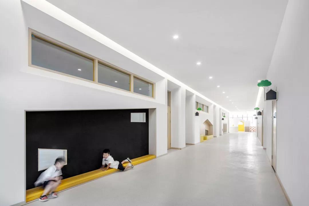 內部空間的重組,給我們帶來新的機會,在內部我們繼續用“插件”這個動作,來完成空間的氛圍表達。兒童空間我們認為最重要的就是激發孩子的幻想,提供屬于一個他們的自由空間。所幸的是,我們發現孩子們喜歡一次又一次的去體驗空間帶來的快樂。為了達到這個目的,我們還在每個教室做了一個只適合兒童的空間,而家長是不適合去的。在一層的大廳有一個彈網區域,變為一個充滿挑戰和好奇的空間,同時還插入一個貫通二樓到三樓的垂直房子,孩子們可以在這蹦來蹦去,來回奔跑,自由玩灑。