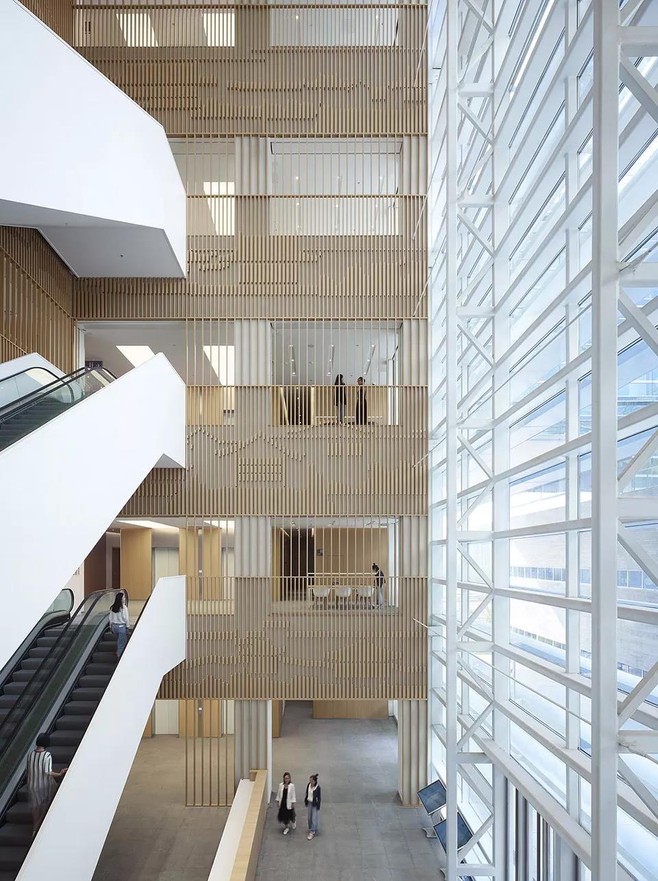 根據(jù)公共空間與書庫的不同使用要求,圖書館建筑被分為兩部分,它們在基座與上層空間中相互連接。書庫部分厚實的外墻設計采用水平線條木紋肌理的清水混凝土,與通透的玻璃幕墻包裹的公共區(qū)域相互交疊。立面較為封閉的智能書庫位于地塊北側(cè),而采用通透立面設計的閱覽室則位于南側(cè),朝向城市景觀。地上六層建筑層高均為5.7米。
