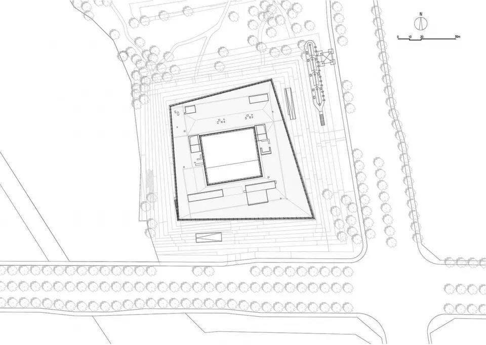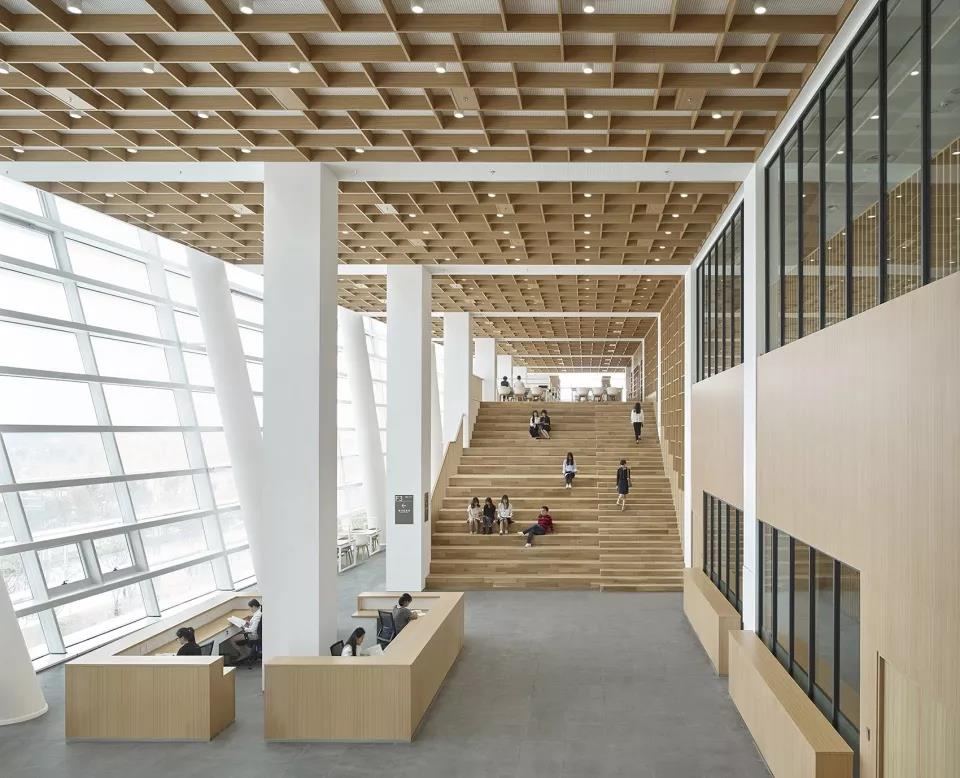 兩部分建筑體量,被建筑東西方向軸線上的公共廣場分隔開,圖書館主入口也位于這個被抬高的廣場兩側(cè),可經(jīng)由大臺階到達廣場,進入圖書館南北兩區(qū),同時可由廣場到達書香公園。通過提供穿越場地的捷徑,引導眾多市民進入這兩部分建筑,建立了建筑內(nèi)外空間的功能性連接,將圖書館及其多元化的文化活動,整合到城市結(jié)構(gòu)中。