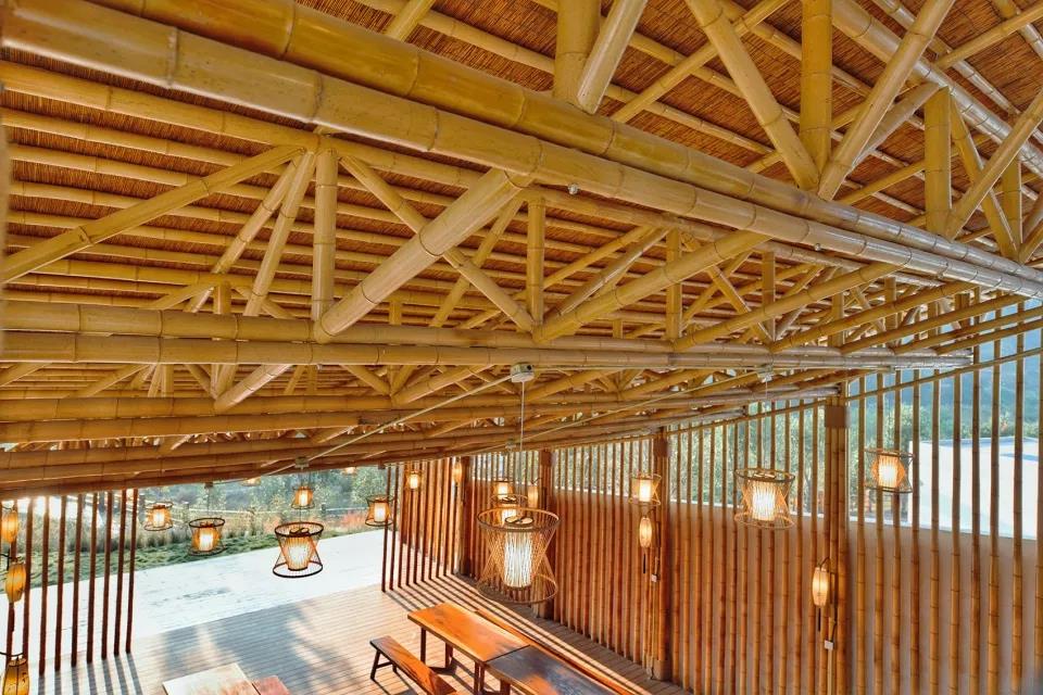 經過與竹匠、施工廠家的不斷磋商,最終提出了一個竹桁架的“概念”,利用竹木完全模擬鋼管桁架的做法,同時,對薄弱環節進行加強。為了確保更好的結構穩定性,竹棚的柱子采用了六根8cm原竹合攏的做法,同時,為了保證竹桁架的整體性,增加了竹斜撐作為輔助構件,整個竹屋架體系漸變復雜,全部在現場經多年經驗的竹匠和工人手工加工完成。為了增加整個頂部的抗拔性能,兩面又增加了直接拉地的竹墻體系。竹客廳拉結均勻,造型含蓄,迎風面低矮,背風面最大拉高,盡量順應有可能遭遇的大風天氣。