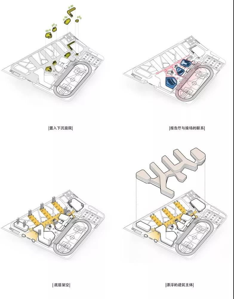 自由靈活的建筑功能布局為建筑的使用方式及流線組織賦予新的可能,教學(xué)參與者的交互不止于教室中,更存在于校園空間的每一個(gè)角落。設(shè)計(jì)將校園核心教學(xué)區(qū)域底層整體架空,僅由引導(dǎo)性豎向交通空間與三個(gè)不同規(guī)模的報(bào)告廳組成。
