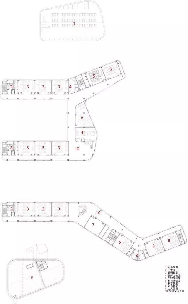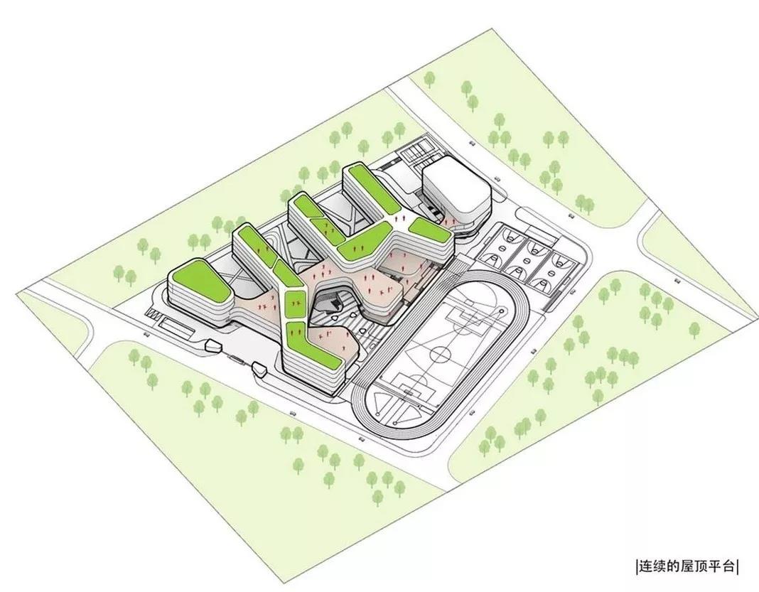 為了最大限度地將“陽(yáng)光、綠地和空間”融入校園,采取架空、穿插、拼疊、錯(cuò)動(dòng)、屋頂花園等手法,使建筑本身成為聯(lián)系校園眾多功能及區(qū)域的紐帶。多標(biāo)高的屋頂平臺(tái)也被賦予了不同的使用功能和教學(xué)意義,在豎向上也豐富了校園的第五立面。