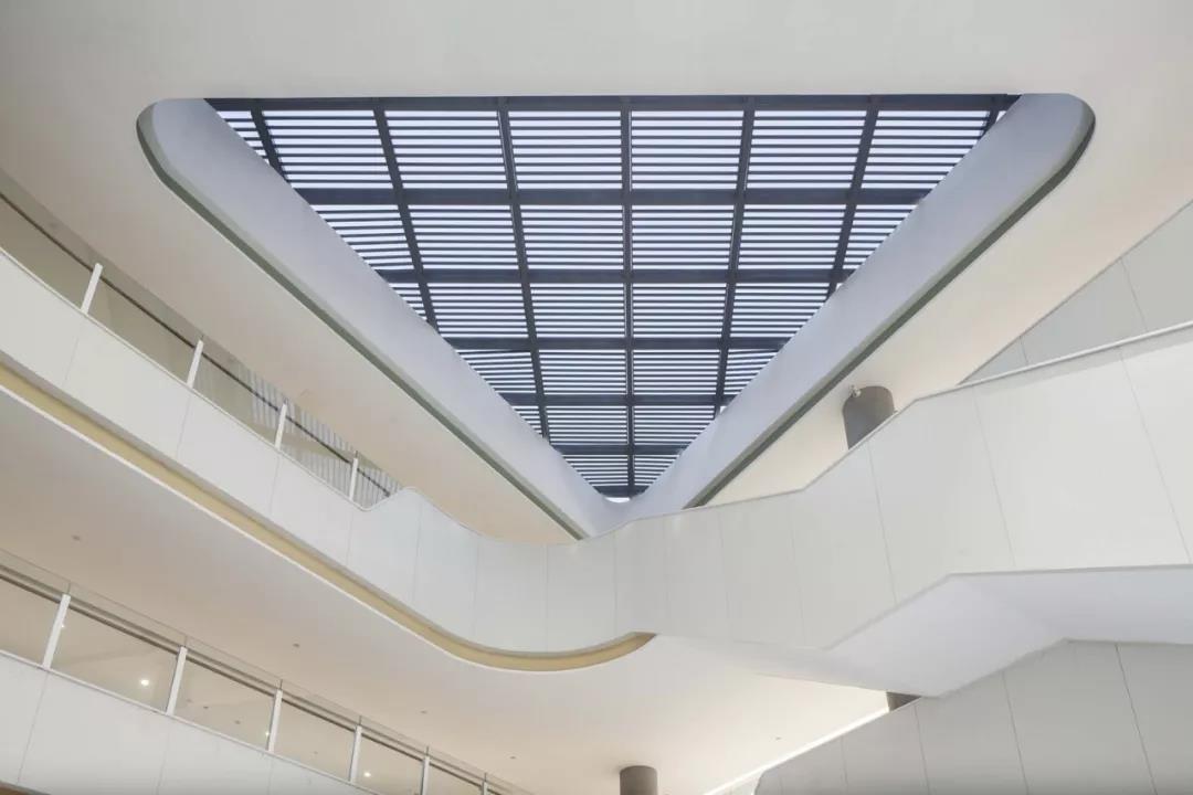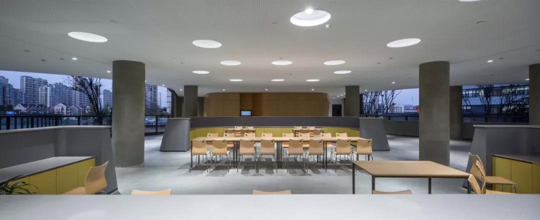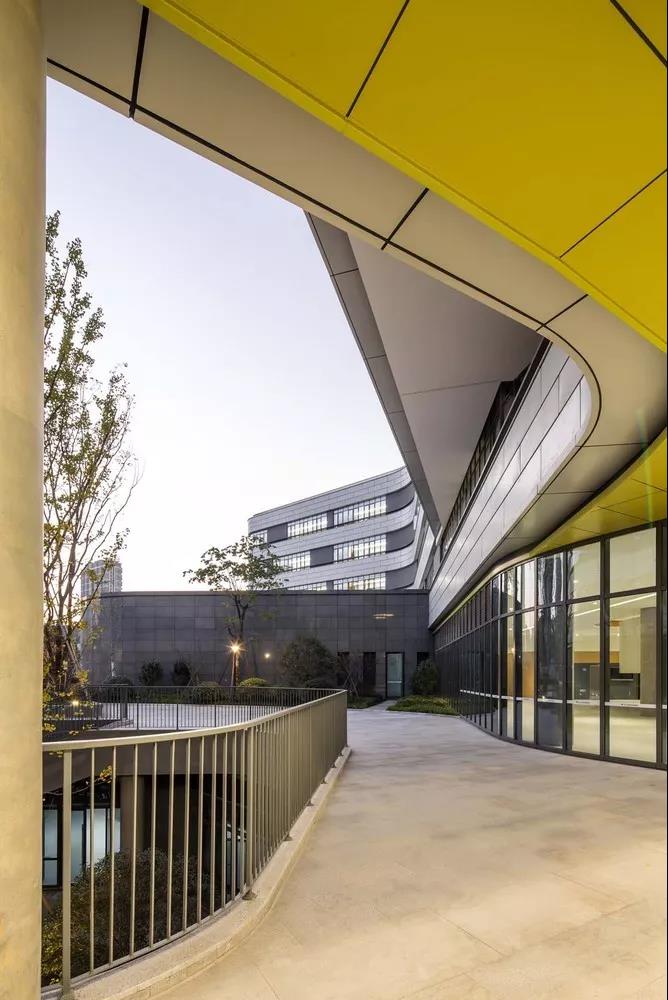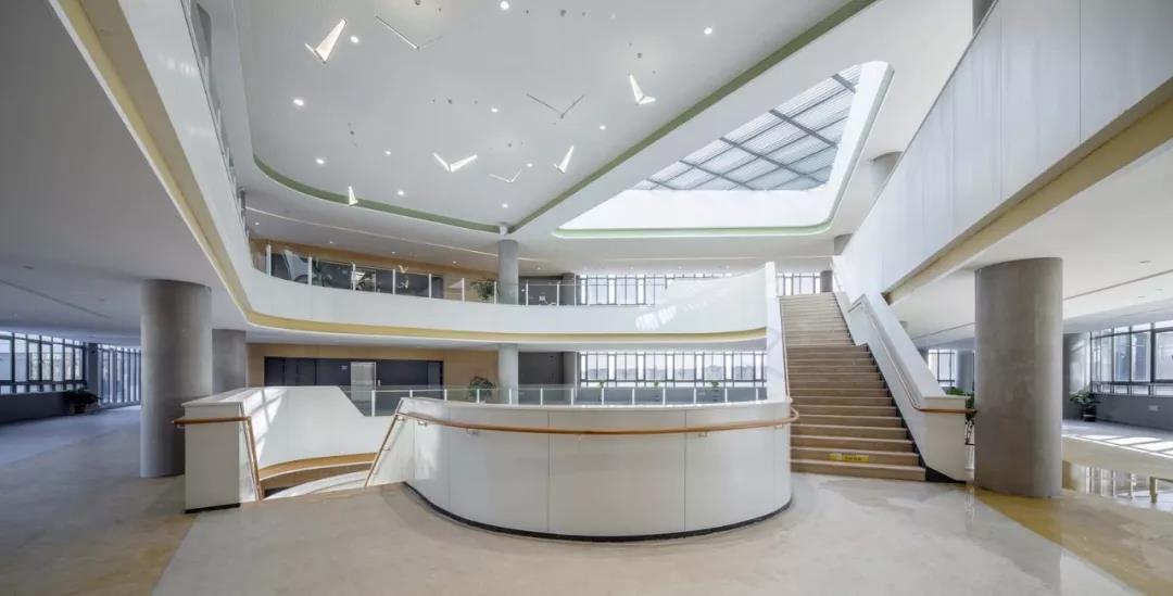 通過(guò)明暗對(duì)比和細(xì)部處理,體現(xiàn)簡(jiǎn)約而生動(dòng)的建筑組合,以多層次、多維度的立體校園,賦予與杭州濱江區(qū)智慧新城相協(xié)調(diào)的新時(shí)代當(dāng)代校園的建筑特征。綠色調(diào)的蜂窩鋁板吊頂搭配清水混凝土柱的架空層,是室外綠化景觀的空間延續(xù),可以消除學(xué)生的緊張心理,活躍空間氣氛,促進(jìn)學(xué)生身心健康發(fā)展。