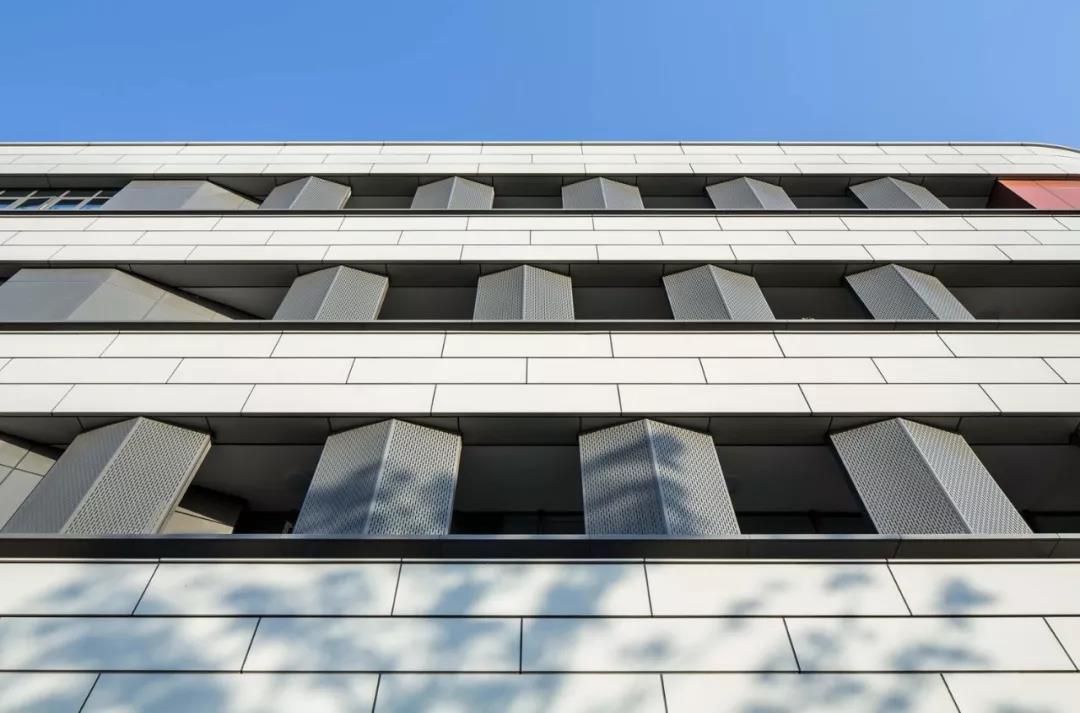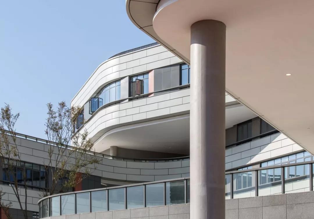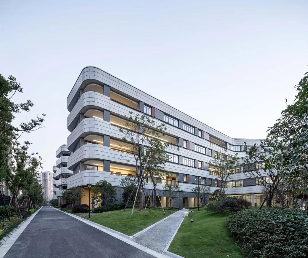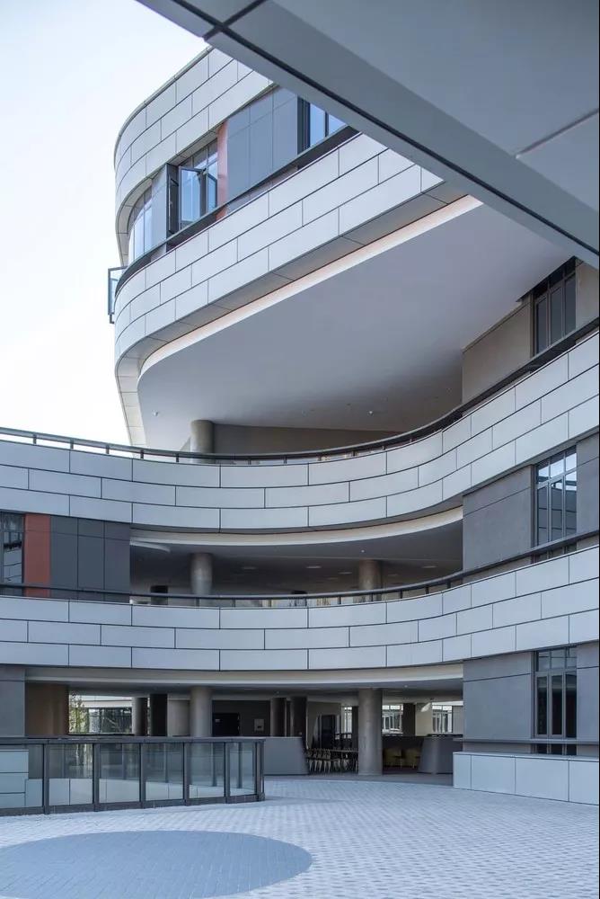 水墨淡彩,書(shū)聲瑯瑯。建筑主體采用連續(xù)環(huán)通的淺白灰色仿陶鋁板錯(cuò)縫拼接,突顯整體水平流動(dòng)感。外廊局部敞開(kāi),多角度灰色鋁板錯(cuò)落層間,點(diǎn)綴些許紅色,為立面效果增添了韻律動(dòng)感。